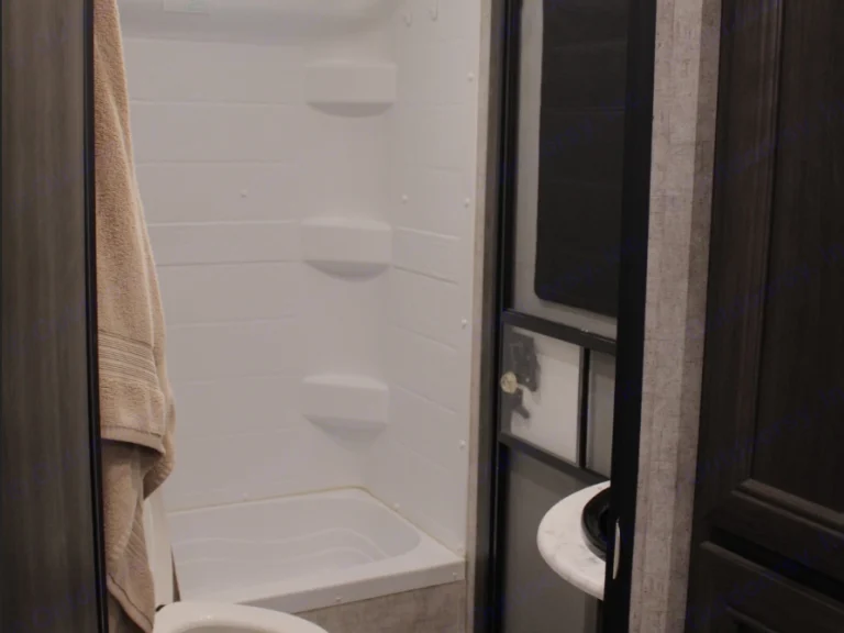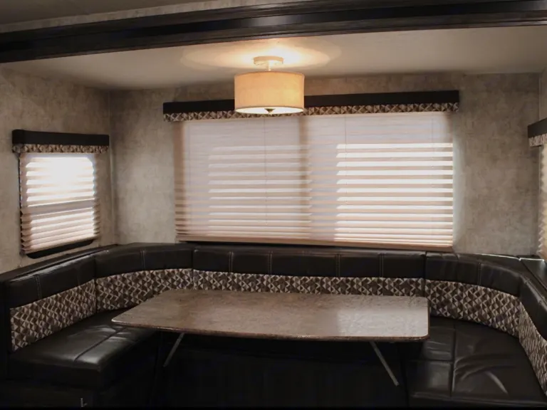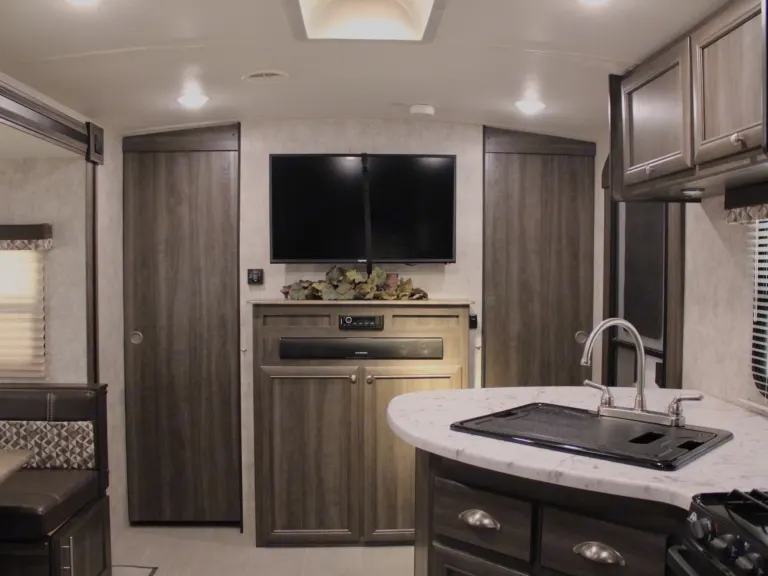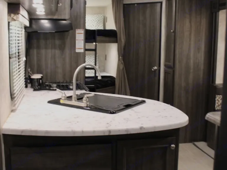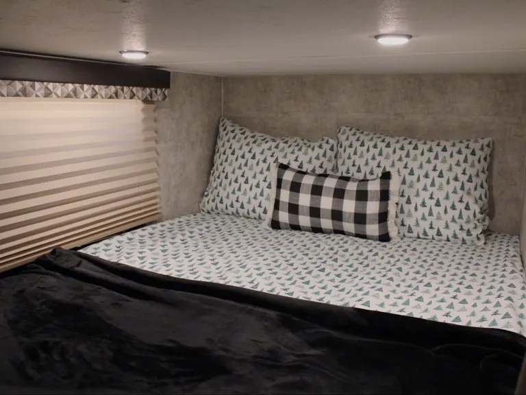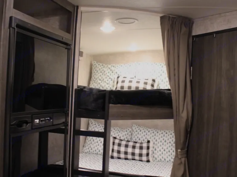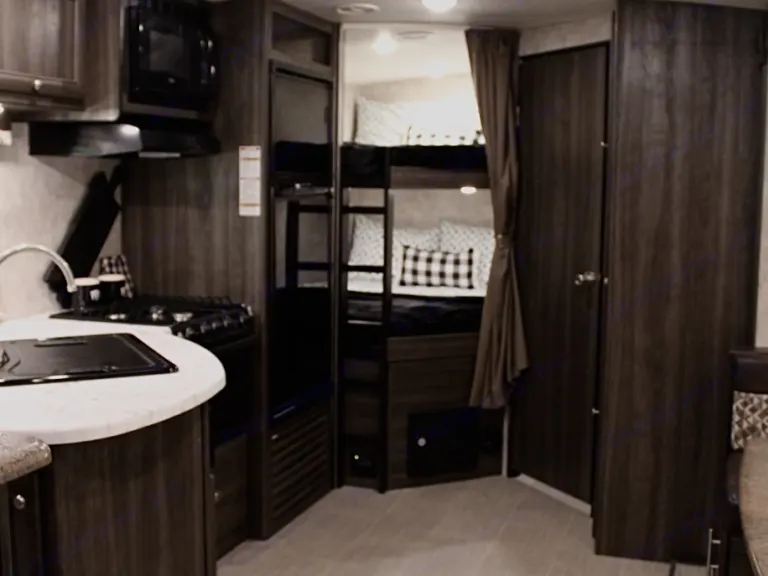 Our family's trailer is a beautiful RV stocked and ready for all your camping needs. This features a queen bed in the master bedroom, separated from the rest of the RV with two sliding barn doors. The kitchen is fully functional with an oven, range, fridge, freezer, kitchen sink, and tons of storage. The dining area sits on a single slide out that gives the whole trailer a very open feel. Beyond the kitchen lies two full size bunk beds and a bathroom featuring its own exterior door. We find that the second exterior door on the bathroom is particularly useful on beach trips for sandy kids, or when we camp with family and want to allow them to use our bathroom during the night.This trailer has a 52 gallon fresh water tank. The black and grey water tanks are 29 gallons each. The powered awning gives you an extra 18 feet of shade on the hot summer days. And an electric tongue jack makes for a much easier process of hooking and unhooking.We hope that you enjoy our trailer as much as we do. We strive to help you have the best RV experience. We are always open to answer any questions that you have.What's includedKitchen supplies: