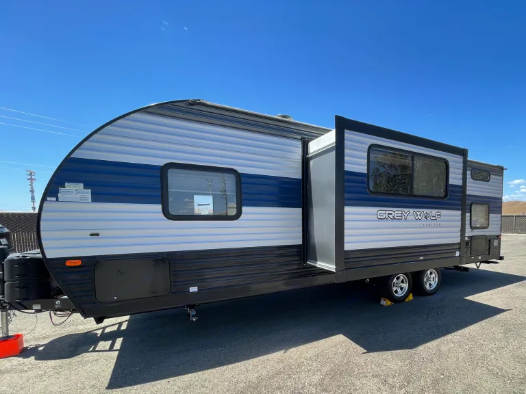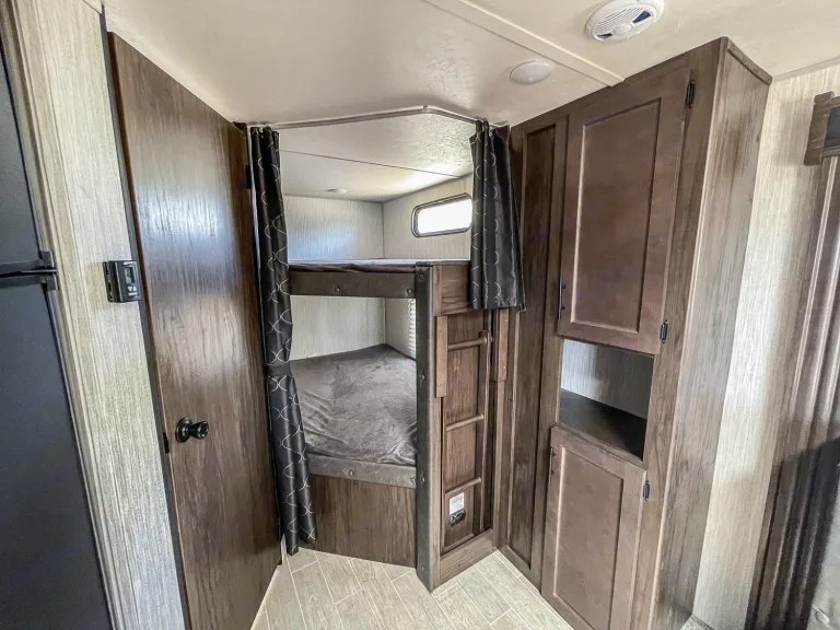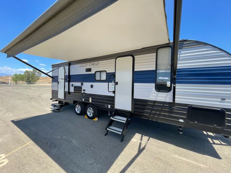 Welcome to our spacious Grey Wolf!This 2021 bunkhouse model has plenty of room for the whole family. The front of the trailer has a private bedroom with a queen size bed. The double size bunks sleep 4 and the dinette conversion another 2 people. The dinette slides out to provide maximum space. We include everything you need to grab the trailer and go:- Pots/pans/utensils/knives