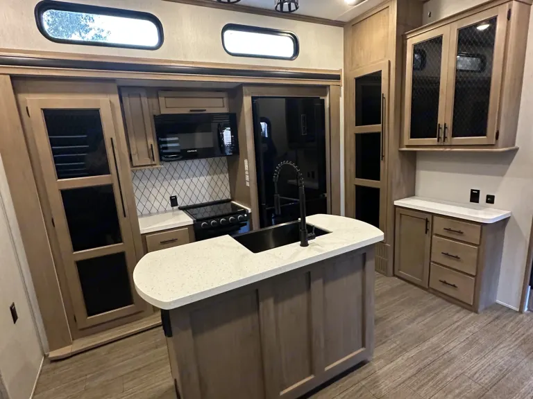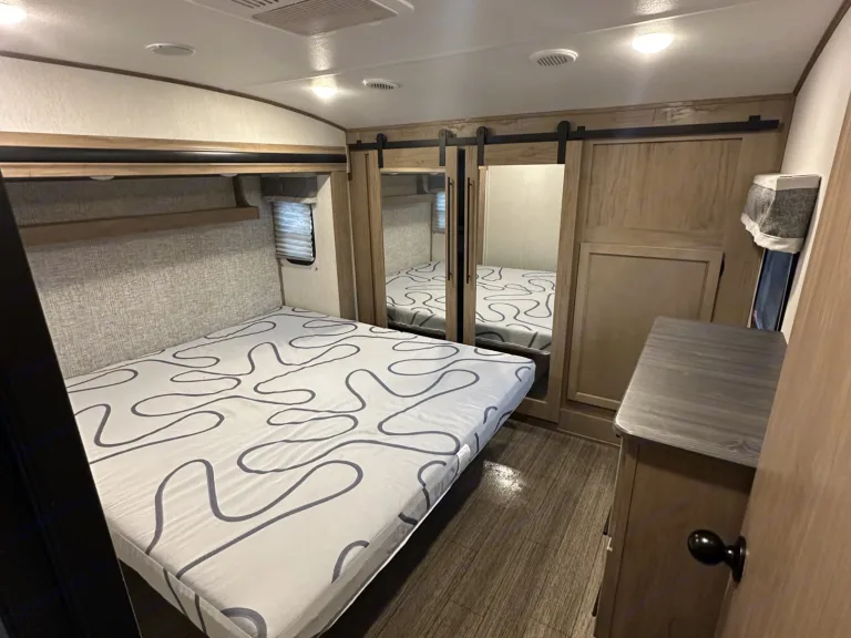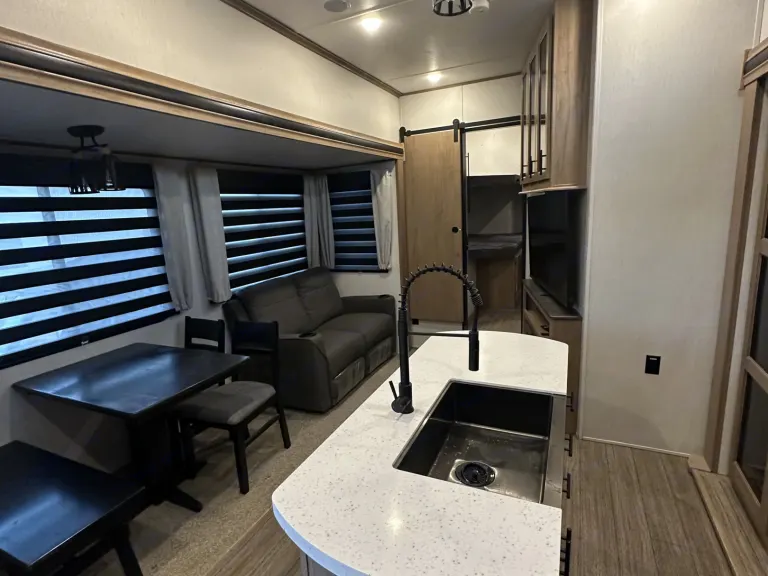 Great for a family. Master bed and bath up front, kids bunk room and half bath in the back. Residential size fridge, comfy recliners and big windows complete the living/dining/kitchen. Comes with an outdoor kitchen with a mini-fridge and sink. We clean it from top to bottom after each rental. We deliver, set up, ready for your trip! What's included• Stocked kitchen (pots, pans, utensils)