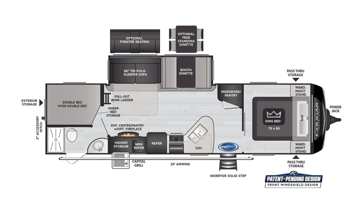 Our camper rental is the perfect way to explore the great outdoors with your family. You can cook meals together in the fully equipped kitchen, relax by the fireplace, or enjoy a movie on the TV. The outdoor kitchen is perfect for summer cookouts, and the bunkhouse floor plan is perfect for kids.
