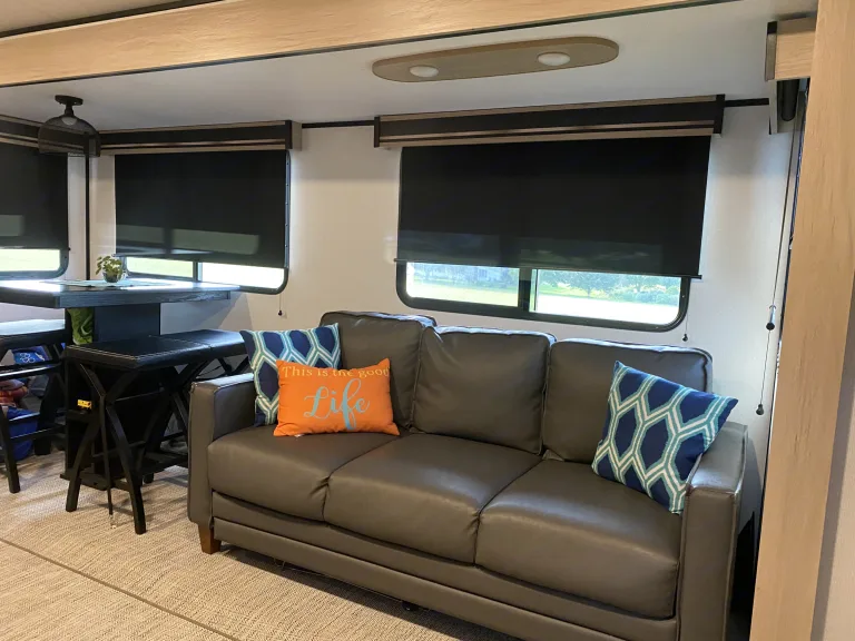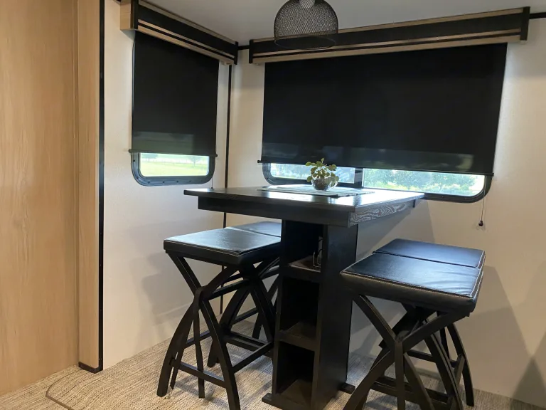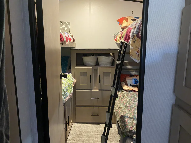 welcome to your home away from home this Crusier Radiance is set up great for a family week or weekend away. featuring a bunk room in the back for 4 kids to have their own beds, with a storage cabinet for each to have some space to function with clothes ect... the main living space is open concept with a bar stool dinette, sofa and kitchen work space. The front of the trailer features a separate bed room with a queen size bed and wardrobe storage.