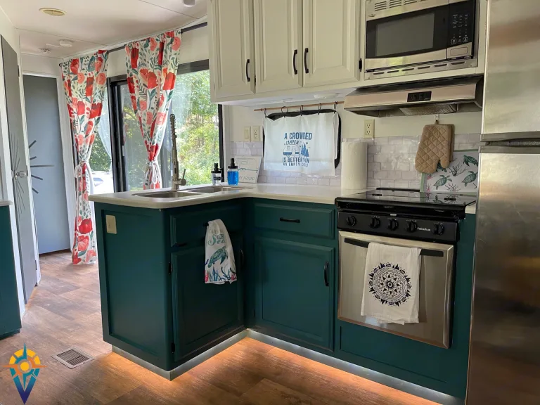 The full kitchen is equipped with everything you need to whip up delicious meals on the go, including a refrigerator, microwave, stove, oven, and sink. And when it's time to relax, the entertainment system stereo system has got you covered.