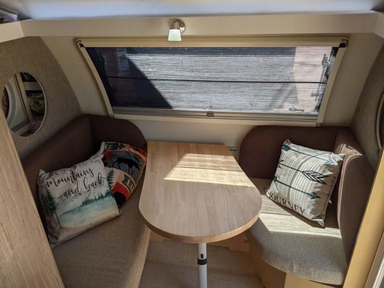 This trailer is the ultimate road tripping tow trailer for two adults and a child (or two younger children sleeping on a twin mattress) who have a tow vehicle with a tow rating at or above 3500lbs. You can pull over just about anywhere, turn on the A/C, and sleep for the night.The Nucamp TAB 400 is what happens when you fuse Ohio Amish craftsmanship with modern, European styling. Equipped with a true queen-sized bed, 24" TV and entertainment center, full kitchen, larger wet bath and second sleeping area. In addition, the TAB 400 features some of the most innovative components in the RV Industry. This trailer is designed to be towed behind a mid-sized SUV or truck. It weighs in at about 3000 lbs tow/500 lbs hitch fully stocked for a trip with water and basic essentials. This unit is the king of boondocking on paved and maintained roads.Additional features include: Energy-efficient Heat Pump Central Air Conditioning, Alde® Central Heat & Hot Water System, 24″ TV/DVD/AM/FM/Bluetooth®, 2-Way Fridge, Spare Tire, and Electric Brakes.Integrated Victron Lithium Battery System: