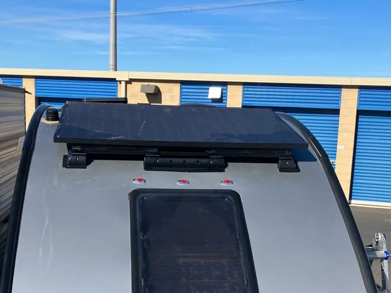 - MC4 connectors on front and rear of trailer for two additional solar arrays for up to 1600w additional. (400w roof top, 600w rear port & 900w front port) For example, I travel with 400w of fold out panels (optional for rent) to plug in once I setup camp as well as 750w of solar on my tow vehicle truck bed rack. I get around 6kwh while traveling and 9kwh while camping per sunny day. This allows me to camp entirely off the grid without ever running the generator.