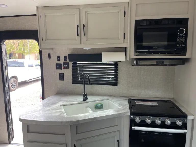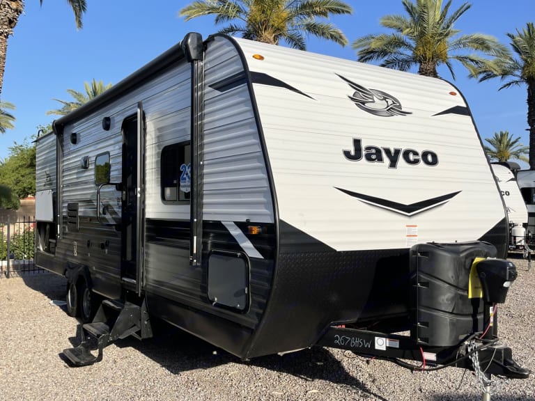 2022 Jayco Jayflight travel trailer ready to rent! We are avid campers and have this beauty fully equipped and ready for your next adventure. Fully equipped kitchen with all the supplies you need (even a Nespresso coffee maker!), two full size bunks with a 300 lb weight capacity, dinette bed conversion, jackknife couch as well as a separate master bedroom with a crazy comfy queen bed. Outdoor kitchen provides a mini fridge and sink as well as optimal outdoor storage. Two tvs with DVD players inside. What's includedFull kitchen with all supplies, linens, multiple camping chairs, two easy up, propane fire pit, tableRecommendationsWe love camping off the Rim as well as staying in the valley during winter and going to the White Tanks!Other things to noteAbsolutely no smoking.