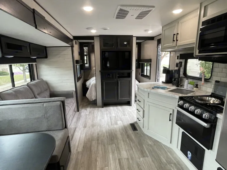 Trailer sleeps 6 to10 people. Master queen, bunk beds, pull out sofa and dinette conversion. Modern farmhouse Kitchen includes stove/oven, microwave, kuerig, toaster. Kitchen opens to living room and dinning room. Tv in living room. Stereo with indoor and outdoor speakers. Bathroom areas has standing shower/tub, sink area is separate from bathroom. Outside griddle and mini fridgeWhat's includedFresh sheets and towels. Flooding picnic table, outdoor rug. Kuerig, toaster, pot/pan, silverware, dishes, knives, cutting board. Generator if needed.