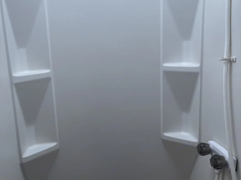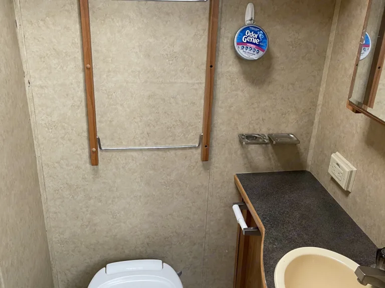 Shower fits 6 feet tall folks, toilet with soapbox holders.