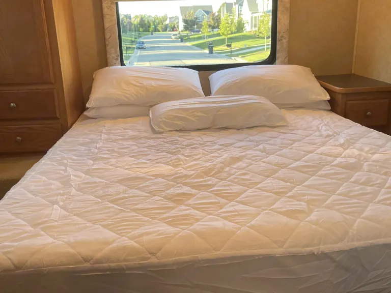 Short Queen-size mattress with an elastic-fitted mattress pad for 2 adults.