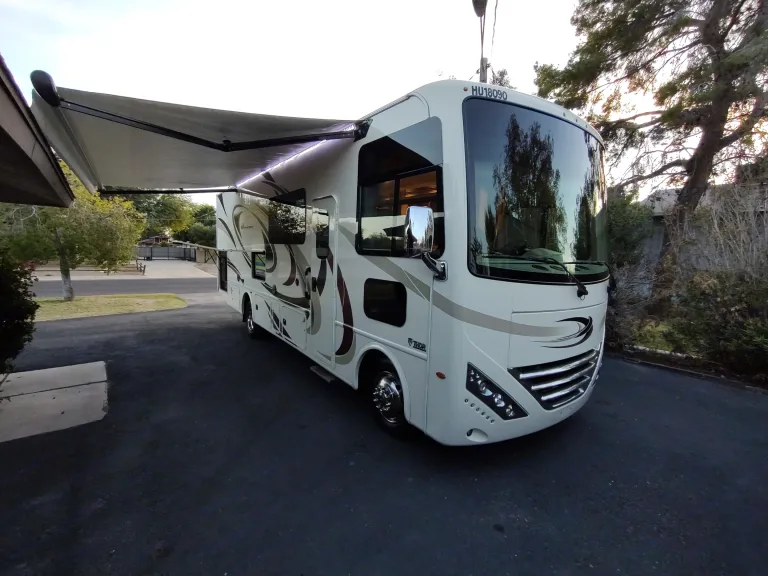 Maybellene is a Beautiful 2018 Thor Hurricane 29M Class A RV. She is ready for your next adventure! With a massive front window you can see everything while you are driving to your destination.Sleeps up to 8 people. The king bedroom in the back of the RV has a privacy door for added comfort. Dining table converts into a bed. The couch pulls out into a bed and there is a bunk above the driver and passenger seats that comes down into a bed.Outside you have an outdoor shower with hot and cold water valves. An outdoor kitchen with fridge and sink. Also, a TV to watch your favorite game or movie.Inside you have one big slide out that makes enough room to fit your entire crew. Driver and passenger seats swivel around to provide extra seats for your guests.This RV is perfect for the whole family or just some extra leg room for a Romantic weekend getaway!