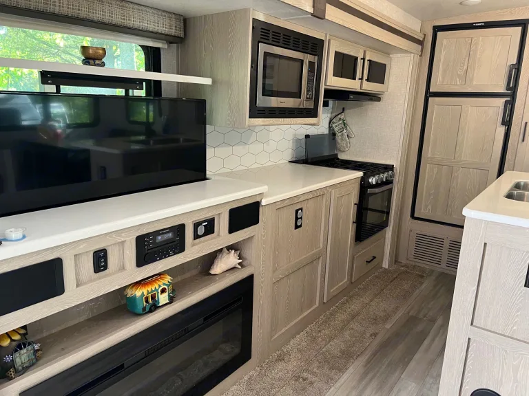 The kitchen it fully equipt with everything you need to cook a home meal. Don't feel like cooking inside? Enjoy the outdoors and cook on the outside stove! There's also a grill hookup!** We do offer delivery, will even set everything up for you and empty your tanks for you so you have nothing to worry or stress about.** You have some fur friends? Bring them with you, we love dogs/cats and are happy to host them. Accidents happen, we understand but there is some carpet throughout so if an accident does occur we may need to charge a carpet cleaning fee.**Our trailer camper is professionally cleaned and sanitized before/after each use. Its incredibly important to us that we provide you with a space that feels homey but also new!**We are ok with dry camping/off grid but as a courtesy please let us know before hand. We can fill the fresh water tanks & attach our “grey holding tank”.What's includedTowels and wash cloths