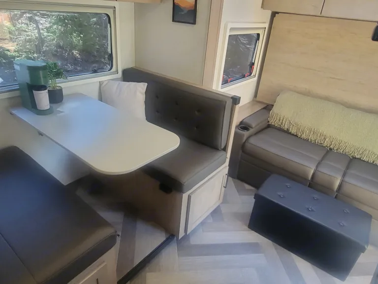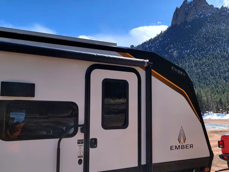 Once you get there, you'll be able to relax in comfort and style. The Ember 191MDB is packed with amenities that will make you feel like you're living in a luxurious hotel, including comfortable beds (bleached white linens), a beautiful bathroom, and an extremely functional indoor kitchen. You can even cook and dine outside under the electric awning at the outdoor kitchen, all while enjoying the breathtaking scenery around you.