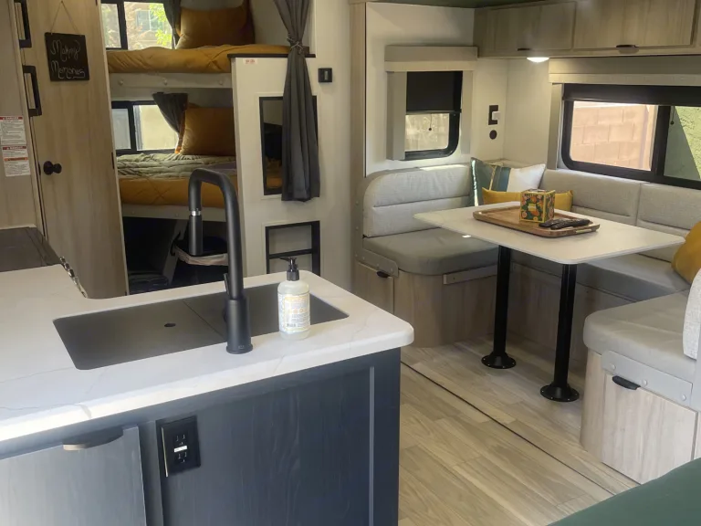 Brand New Minni RV. Sleeps 5 comfortably. Everything is included when you rent with us. We are Better RVs. We would like to out do any other RV rentals out there. What's includedEverything is included. All you need are your clothes, food, and cosmetics. Coffee pot. waffle maker, fully loaded kitchen, linens, towels, camping chairs, Blackstone griddle with quick connect hose, 4 foot table, outside rug and trashcan, JBL Stereo system and moreRecommendationsThis RV is best with water and electric hook ups. Campsites with hook ups is where you need to take this Minni.Other things to noteNo Smoking inside the RV. There will me an additional $500 cleaning fee.