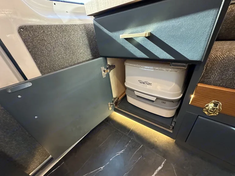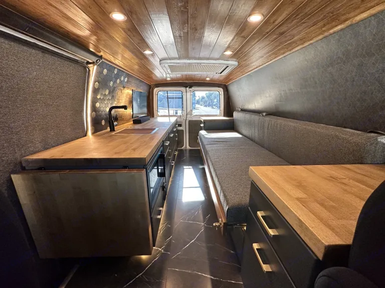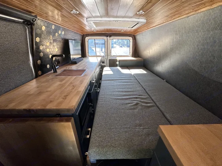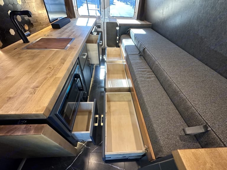 The Camper Van Adventure is a 18 foot van which has been converted and will accommodate 2 people. Don't let the size fool you, there is tons of storage space for a van this size. The couch in there is a futon that slides out into a bed for 2. It comes with a small mini refrigerator that can keep your lunch cold at 40 degrees (it uses 12v so it doesn't drain the batter too fast). It also comes with a microwave, kitchen sink, TV, sound bar, Amazon Fire Stick, Hdmi input so you can plug in your own devices, USB/USB-C charging ports just about everywhere, extra home plugs (110v), 10 gallon fresh water tank, 5 gallon grey water tank, and a portable toilet.The camper van does NOT come with an awning or canopy. What's includedWe'll include the following, but also let us know if you'd like to bring your own:-2 Camping Chairs
