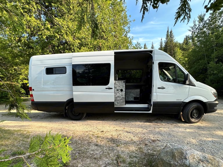 Explore the wonders of Michigan in this ultimate road trip machine! Our 2015 Mercedes-Benz Sprinter Van gets an amazing 22 mpg and is equipped with a king-sized bed (with bedside phone holders and charge ports), an inviting cabin area with a fridge, sink, microwave, and a huge rear storage space for all your equipment (luggage, bikes, camping/sports gear, etc.).Grab your partner, best friend, or ride solo and GO! This van is perfect for weekend, 5-day, or even week-long trips around Michigan: to Traverse City, the Upper Peninsula, Mackinaw, and beyond!Our van was built and equipped to optimize the traveler's experience. The simple yet stylish interior keeps the van lightweight so travelers can enjoy amazing fuel efficiency while on the road. The thoughtful features such as a dual battery system and an extra-large bed allow travelers some modern comforts while out exploring.In addition to the basics, our van has custom cabinetry, epoxy countertops, no-slam drawers, 5-gallon sink water tanks, ceiling vent fan, a 6-speaker stereo system, heating furnace, windows for easy airflow, blackout curtains, window/door screens, and so much more!Important Notes- Please bring your own blankets & advanced cooking gear- No cabin AC. The van has dash AC while running, but that is not meant or able to cool the cabin area- There is no septic system. There's a bagging toilet system that is prepared in the van, but we suggest renters use outside restroom facilities if/when possible for better convenience and comfort.- The van needs to be connected to shore power (aka "plugged in" to a power source) in order to get full electrical capabilities of outlets and appliances. When not connected to power, only lower-voltage items will function: lights, ceiling fan, sink faucet, 12-volt phone charging ports, etc. Larger items such as the microwave and the 110-volt wall outlets will NOT work when the van is "off-grid". This is standard with most RVs to help preserve batteries.What's includedIncluded is:- 500-watt portable "power pack" for an additional off-grid power source