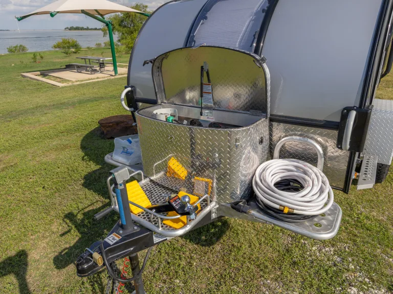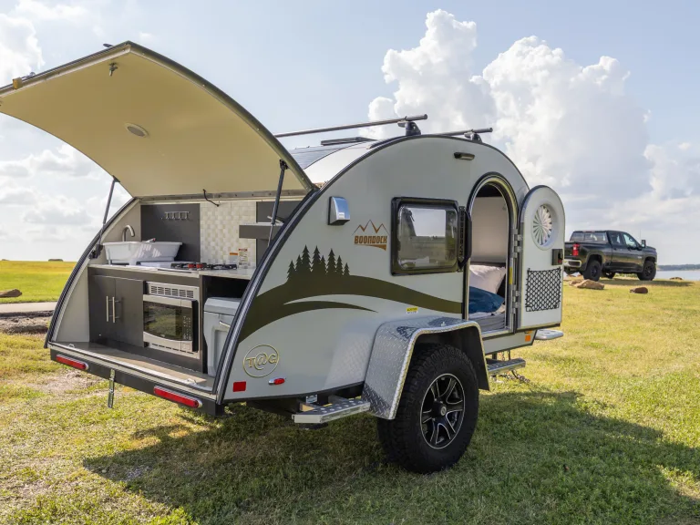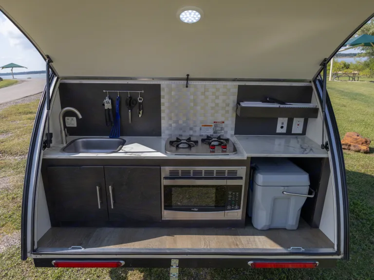 nuCamp TAG XL Boondock. A super lightweight teardrop travel trailer that can be towed with just about anything. Weight is just 1600 lbs. Somewhat offroad capable. Sleeps two adults comfortably. Comes with kitchen equipment, bedding and two camping chairs. 8 gallon water tank, a/c and heater (needs 110V). Can provide a gasoline generator for surcharge. Trailer hitch is included as well, you just need to provide the towing vehicle. Everything is keyless with code padlocks and keyless door lock. Can be picked up from a storage unit in Grapevine 6am-10pm with the provided code.Other things to noteNo smoking inside, no dogs inside please.