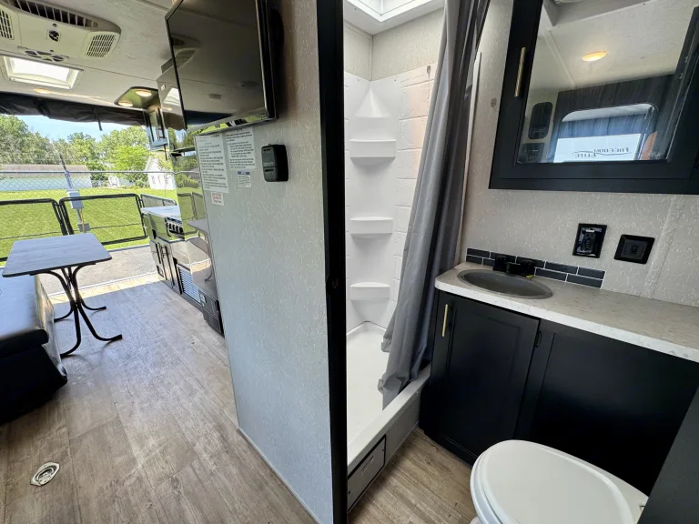 Includes a full bath with toilet, sink, and shower — no need to rough it when you're off-grid or at the track.Entertainment & Extras