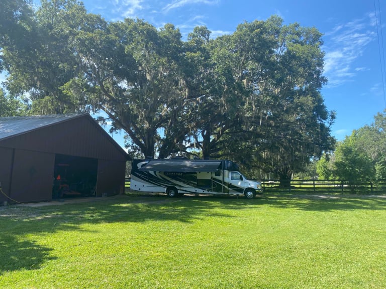 Firefly is an awesome RV. It truly is our home away from home when we travel. Cold ac is required in pretty much year long in Central Florida and Firefly can keep you cool for sure. And on those rare cool nights, there’s a fireplace and heat that will warm you right on up. Or, open up the windows and welcome the sea breezes and listen to the awesome night sounds. Also, renting Firefly at her home base on 5 beautiful country acres is available. We live approximately 45 minutes from major central Florida attractions. Firefly Ranch is a working farm with adopted horses, donkeys, and Zebu bulls. What's includedFresh linens/camping chairs