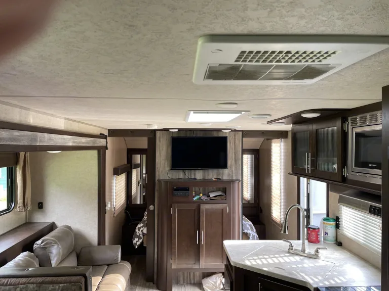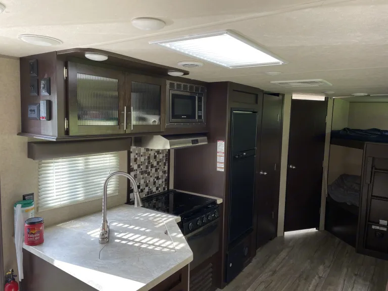 Camper is in good shape. Tires have already been replaced. Queen bed in the Front. Bunks and bathroom in the back. One slide out. Electric awning. Two doors. One door goes directly into the bathroom. What's includedLet me know what you need and we can probably provide it. Camp chairs, etc. Other things to notePets are welcome, but any damage that is done will result in loss of deposit and/or insurance claim. Smoking is not allowed in the camper and will result in loss of deposit.