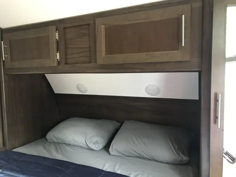 seating area that can convert into a queen bed. Next to it is a sofa that can also fold down into a sleeping area for one.The dinette and the sofa are all part of the slide out of the unit. When the slide out is "out," it opens the unit up so you have plenty of room.In the back of the unit is the bathroom and the double bunk area. The bathroom is equipped with a shower, a tub and a foot-flush toilet with washstand.The camper has a slide out dinette and sofa which both convert into single beds. The travel trailer comes with a 16 foot electric awning.Delivery and setup is available for a fee.----> For insurance purposes the vehicle is equipped with a GPS tracking device. Tampering with or removing this device will result in immediate forfeiture of the entire damage deposit.<——-Large SUV, 1/4 TON TOW-Able, Your Vehicle Must Have A Brake Controller.