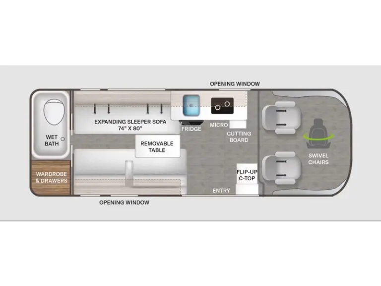 This Thor Motor Coach Twist differs from other models in that the bath is located all the way to the rear so you have more living space up front. The kitchen is just behind the cockpit swivel chairs, with a single door refrigerator, two burner cooktop, and stainless steel sink. Towards the back are two twin beds that serve as seating areas during the day, and at night they can be converted to a king bed. There's a removable dining table to enjoy all your meals. The fully enclosed rear wet bath features a shower and power vent. There's also an outdoor shower to keep things extra clean.