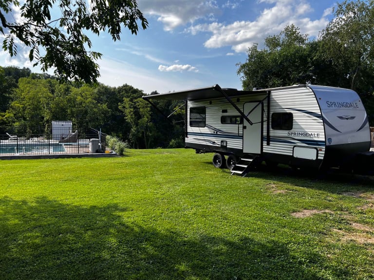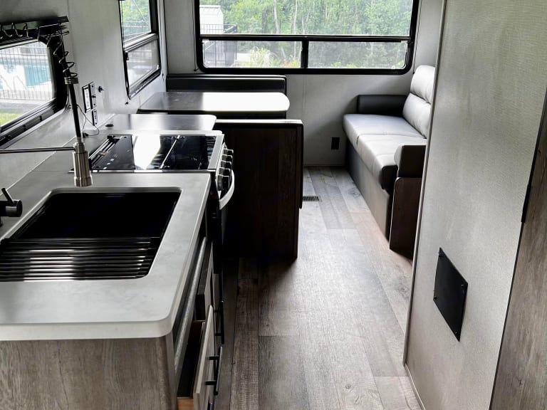 Roam Away From Home is what RV enthusiasts call a "surprisingly clever camper" because it's easy to operate, versatile, and unexpectedly delightful! This nearly brand-new Springdale is built to captivate with more functionality, more storage, more conveniences. The unique layout has the conversion dinette in the back which allows for a large rear window to let in all of the sunlight for a bright and cheery interior during the day and pull-blind privacy at night (on all windows).You'll love the spacious kitchenette with extra countertop space (more than most!) for food prep. It comes with a microwave, propane cooktop & oven, refrigerator, freezer, loads of cabinet storage, and sink with a pull-out faucet.We provide camper-friendly tp, hand soap, cooking spices, spatulas, some pots & pan, and plates.