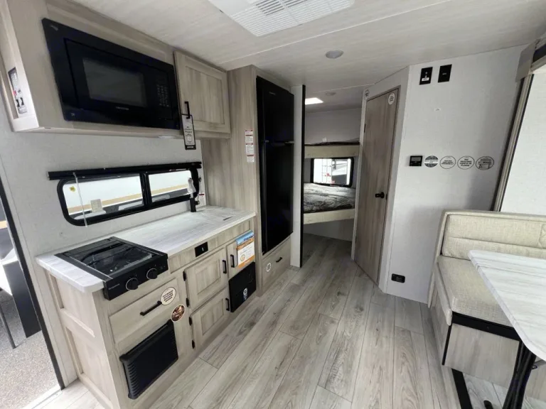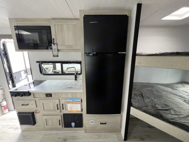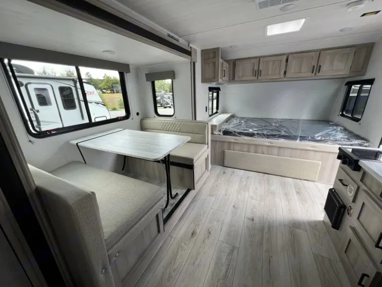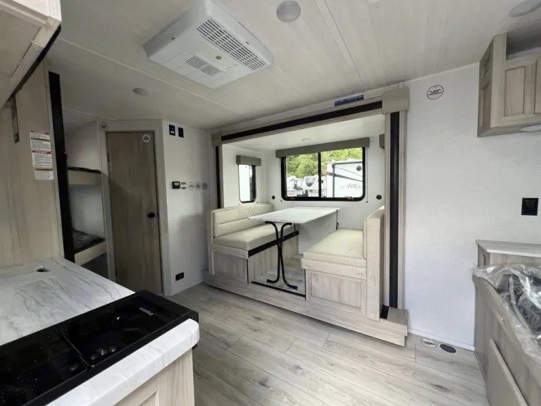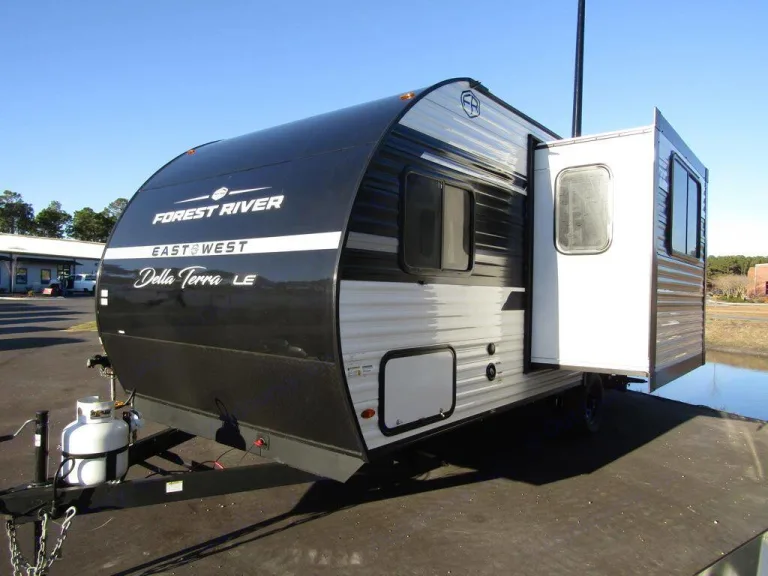 2025 Della Terra 181BHS LE travel trailer single axle, Gvwr 5620 lbs. Sleeps 7-8 with 74" x 60" Queen bed, 50" x 68" double-size bunk beds with storage, booth dinette in the slide out, kitchen with 2 burner stove top, microwave and 10 cu ft 12 volt refrigerator. Corner bathroom with 24 x 40 shower. 200 Watt Solar Panel. Anti-sway hitch with 2" ball provided. Tow vehicle needs 7-pin trailer connector and electric brakes. Wisconsin law requires pulling 3000 lbs. and over to have electric brakes. If you don't have a brake controller installed in your vehicle, you must rent our portable controller that uses an app on your smart phone for $25. Includes linens, dishes, cookware, lawn chairs, fire tongs, campfire tri-pod, and more.