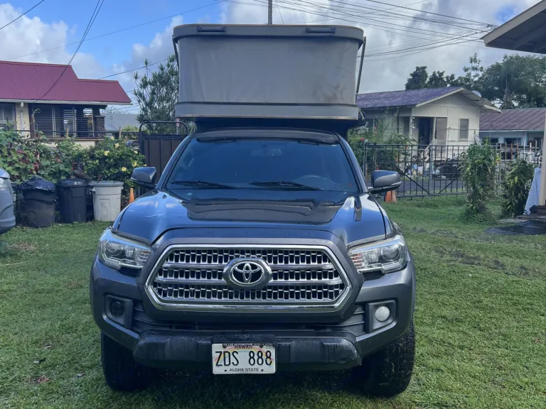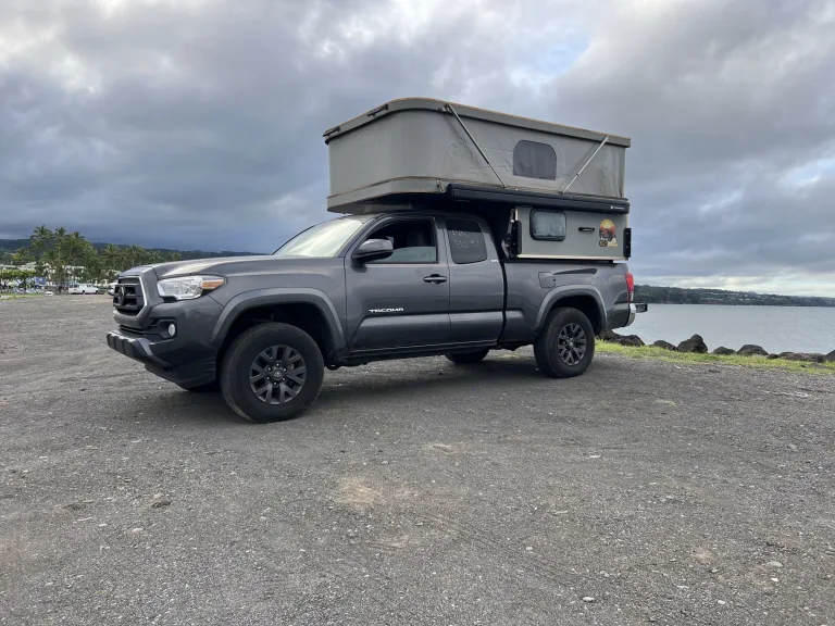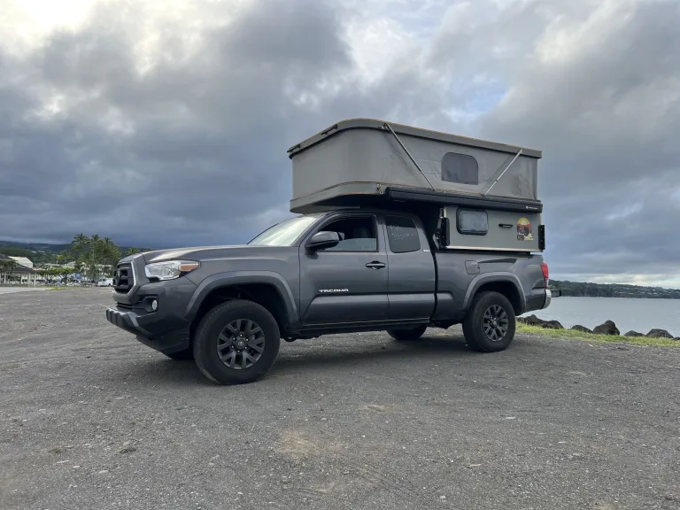 This is a camper with a roof that can be raised or lowered. When driving, the roof is lowered for safety, making it no different from driving a regular pickup truck. When parked, the roof can be raised to create more space.Our camper is like a mobile home that can take you anywhere — very romantic.