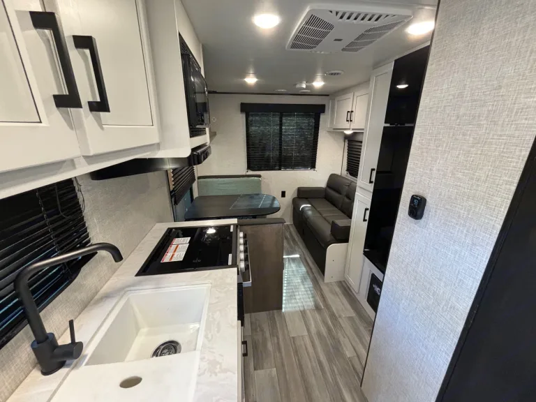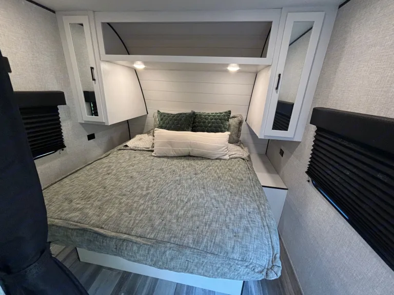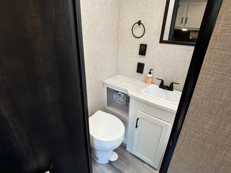 Modern Bathroom: Private bathroom with a shower, toilet, and sink, ensuring convenience on the go.Entertainment Options: Equipped with a stereo system to keep everyone entertained during downtime.Climate Control: Stay comfortable in any weather with air conditioning and heating systems.Easy Towing: Lightweight and easy to tow, making it suitable for a variety of vehicles. is lifted as well!Family-Friendly Amenities: