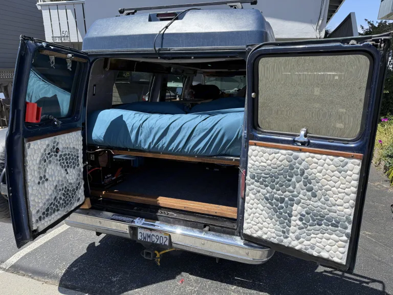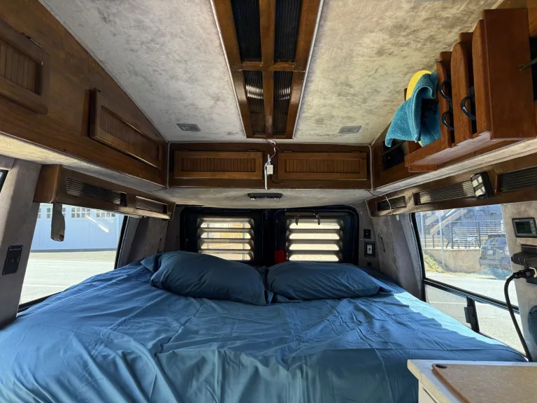 Step into adventure! This RV rental showcases its cozy, custom interior with a bed, smart storage, and a fluffy rug.. Gmc Sportsmobile 1995