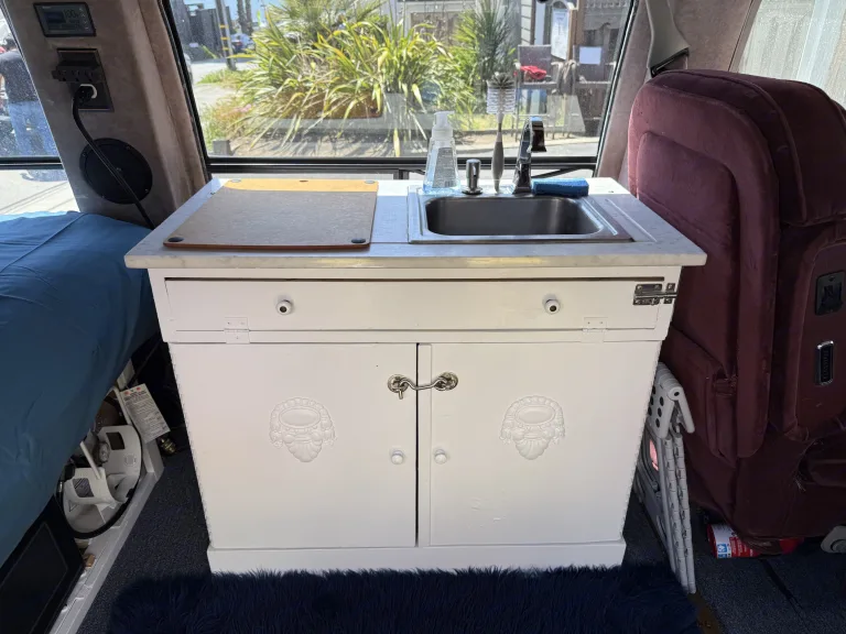 This RV rental offers a comfortable blue bed with under-bed storage, including a Dometic fridge and Sharp microwave.. Gmc Sportsmobile 1995