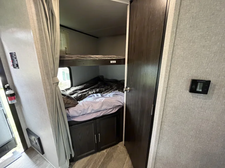 Nice home away from home perfect for family’s with children or if you want a glamping experience with your spouse. Two double bunks can fit 2 children or one adult bottom bunk only. Full queen size bed with small his and her closets. Comes with floaties so you can relax in the water if you want. Other things to noteNo smoking