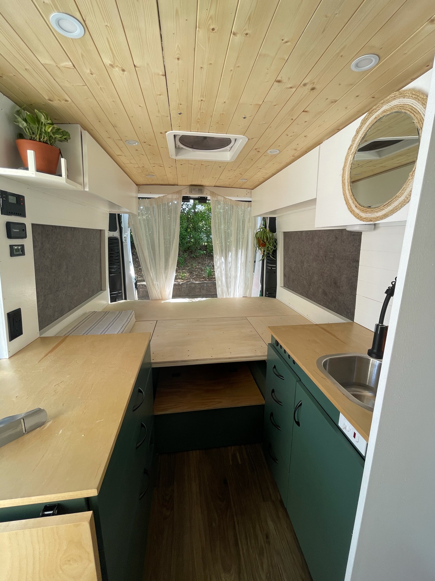 Rent Louie to experience off the grid vanlife! This rig comes with a full shower, toilet, sink, hot plates,bed to dinette conversion and a swivel passenger seat for quick eating options. The garage is spacious and allows for a lot of storage. What's includedFresh linens, 2 camping chairs, eno hammock, towels, eco friendly soap and shampooRecommendationsThis rig has been all over NC. My favorite place so far is the hanging rock state park. Book through their site 24 hours before!Other things to noteThis rig does not require any hookups with rental. The fresh water tank should last you a weekend and your batteries will recharge with the solar panels. If you need additional energy, you can plug in to a regular house plug and charge.Note: hot water requires a hook up (120v). Otherwise, you can run the shower off the solar charge.