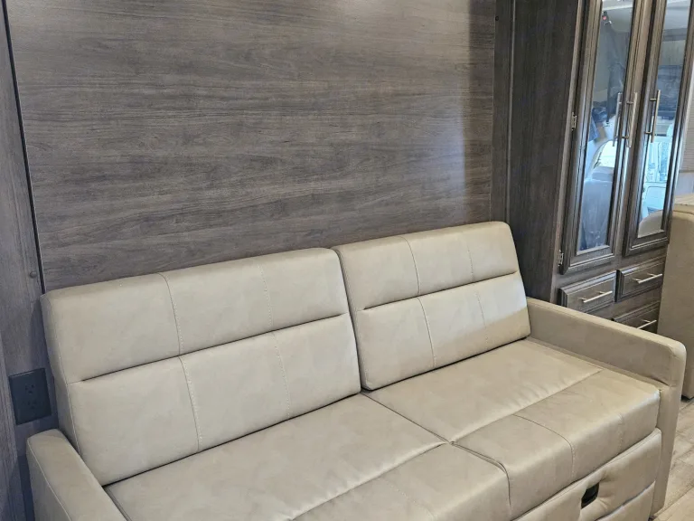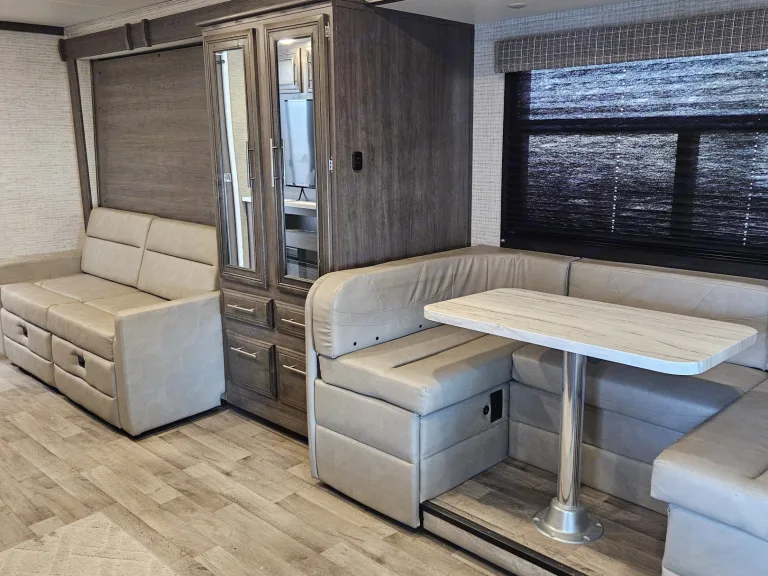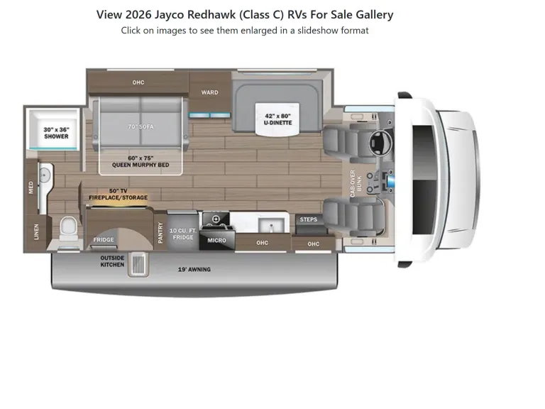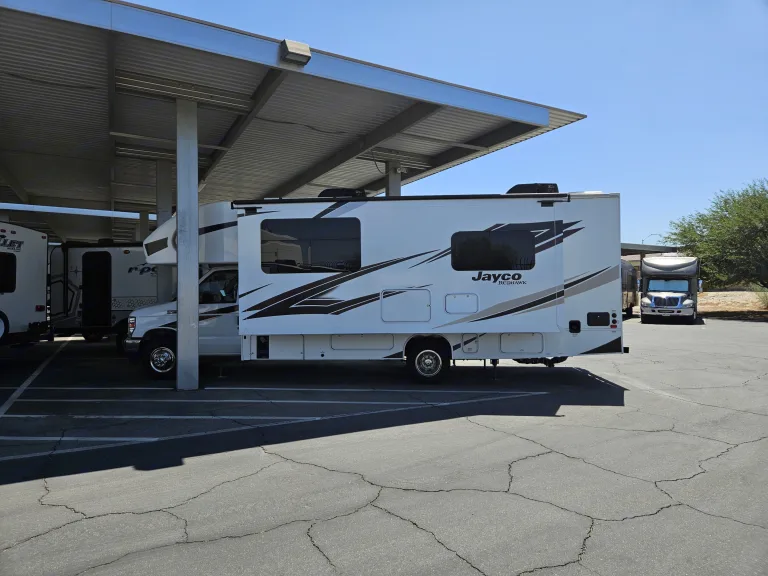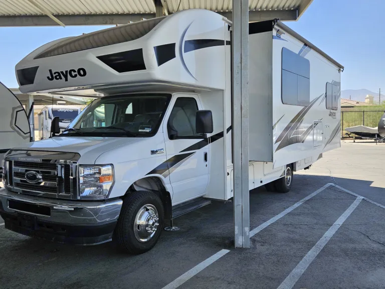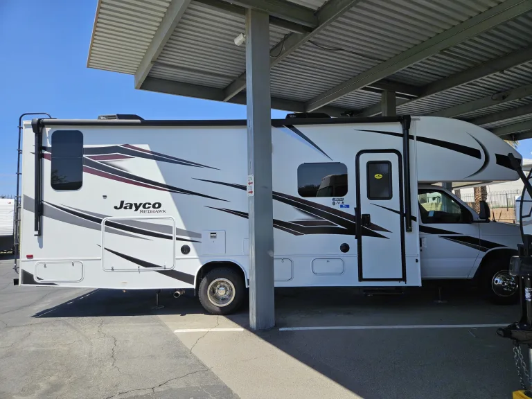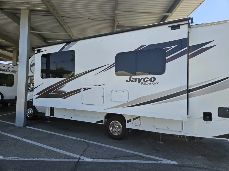 The Jayco RedHawk 26M Class C is great to drive with the Ford F-450 chassis that is equipped with J-Ride. Drive Safety is also a priority, with side-view cameras offering full visibility down both sides of the coach while turning or changing lanes. The J-Ride® handling package adds to the smooth experience, with features like a computer-balanced driveshaft, front and rear stabilizer bars, Hellwig® helper springs, and rubber isolation body mounts. It all comes together for a ride that’s quiet, comfortable, and easy to enjoy—whether you're on a short getaway or a long haul. The one-piece seamless front cap is the only one of its kind on the market. This cap is designed to drastically reduce the risk of leaks in the most common location on a Class C motorhome. With Jayco’s extra attention to durability and detail, you’ll spend more time on the road without worry. With a panoramic front window, rear back-up, side view cameras and monitor. Makes this RV very comfortable and easy to drive. Exterior length is 29 feet, which gives you great space inside with the slide-out and the size makes it easier to maneuver in campgrounds. Redhawk Retreat is set up with an outdoor grill and refrigerator as well as the 19-foot awning and speakers outside.There are camping chairs and coolers for rent in the Extra'SWhat's includedLg microwave, 10 cu. ft. refrigerator, hardwood cabinet doors and drawers, a 9-inch Sony® Infotainment system with Apple CarPlay & Android Auto. Indoor and outdoor speakers and lights. 19 -foot awing, outdoor grill and fridge. 1 king bed (overhead), 1 queen-size (murphy), 1 twin (dinette) bed. TV is a 50-inch LED HDTV either use the digital antenna with signal booster or the park’s cable hook-ups while enjoying the inside fireplace. A power operated Murphy Bed or folds up for a couch. Solar