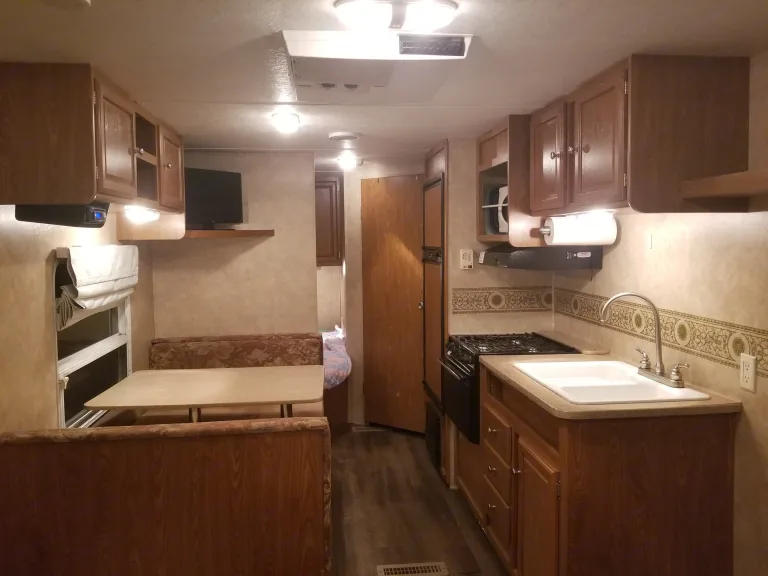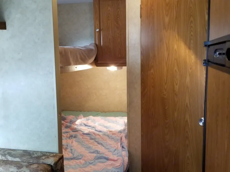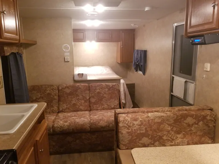 This simple 28ft Dutchmen Sport Lite sleeps 5 people comfortably, and up to 8 if you convert the dinette and couch. There are no bump outs, however, so 8 people would feel pretty tight!Primary "bedroom" features a plush full size bed with storage surrounding the bed, as well as hydraulic lifts to easily access additional blankets in the under bed storage. Outlets on either side of the bed provide easy access to charge your devices or plug in a Cpap, fan, or sound machine.Blackout curtains throughout ensure a great night of sleep. The curtain for the primary bedroom is also a blackout curtain to ensure privacy.Living/Dining/Kitchen area features a jackknife sofa, dinette with bench storage, sound system, 17" TV and DVD player, cordless vacuum, and a stove cover for added counter space that can easily be removed if utilizing the stovetop.The rear bedroom features a twin over full bunk bed with a small wardrobe cabinet for storage. These beds have added padding since the mattresses are fairly thin. There is also storage under part of the bottom bunk.Storage is limited in the bathroom, so to address this there is a shower curtain pocket organizer that hangs on the outside of the shower to hold toiletries. The First Aid kit can be found under the sink, along with extra toilet paper and waste tank treatment tabs.The tankless water heater provides constant hot water. At campsites with full hookups, this ensures hot water for doing dishes any time with plenty left over for a warm bath or shower!Outside storage provides access to our outdoor rug, grilling/cooking accessories, pie irons, and provided standard bag chairs.If we deliver the camper we will park it where directed, level it, connect it to power, and put the awning out. We ask that you not adjust the awning without first consulting with us.There will also be a mandatory Dumping Fee unless the site is a full hookup site.What's includedJersey sheets, comforters, and pillows are provided for the main bed and the rear bunk beds. If you plan to utilize the dinette and sofa for sleeping spaces you will need to provide your own sheets for those. These are sized between a twin and full, so either can be made to work.Towels, hand towels, wash clothes, kitchen clothes, and rag towels are provided.6 standard bag chairs, table top gas grill, dishes, cups, silverware, knives, electric skillet, cutting boards, a firepit grill, and more are all provided.RecommendationsI recommend pre-making some meals. Cooking over the fire is so much fun, but can be really tricky to get just right! Look up recipes for pie irons - some of my favorite things are pizza pies and adding cheesecake mix to fruit pies!Other things to noteIf you are traveling with pets we ask that you use our provided fitted sheet on the couch and towels on the dining table seats if they will be on it. Though we do a thorough cleaning after each rental - this ensures that renters with pet allergies can utilize our camper as well with less concern!If you are traveling with a service animal you will not need to pay the pet fee, but we ask that you notify us and provide a brief description of the work or task the dog has been trained to perform.Only the provided toilet paper can be used in the toilet. No feminine hygiene products, wipes, or regular toilet paper can go down the toilet.No smoking!