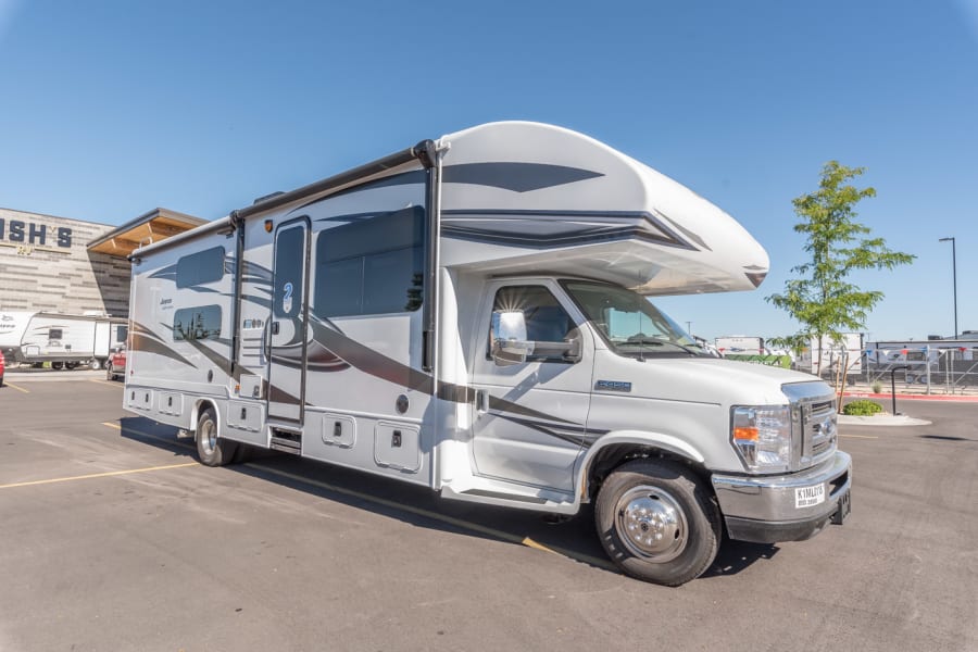 This Jayco Greyhawk Prestige Class C gas motorhome is great for explorers. The camper van has 3-bedroom: with bunk beds, a master suite and queen loft; 1 bathroom with shower and toilet; and can sleep up to 8 guests.