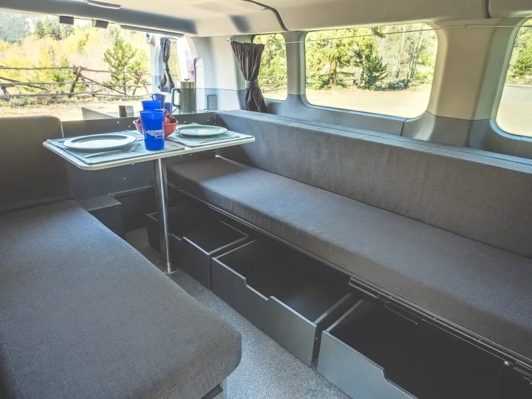 Includes: Queen bed fit out (with storage space), Kitchen fit out (w/ sink, refrigerator & stove), Dual battery system (with solar panel), Free extra drivers (up to 4 drivers allowed)