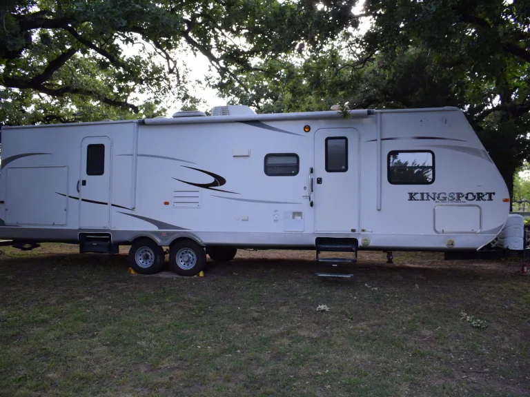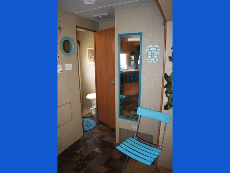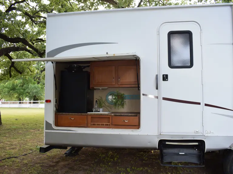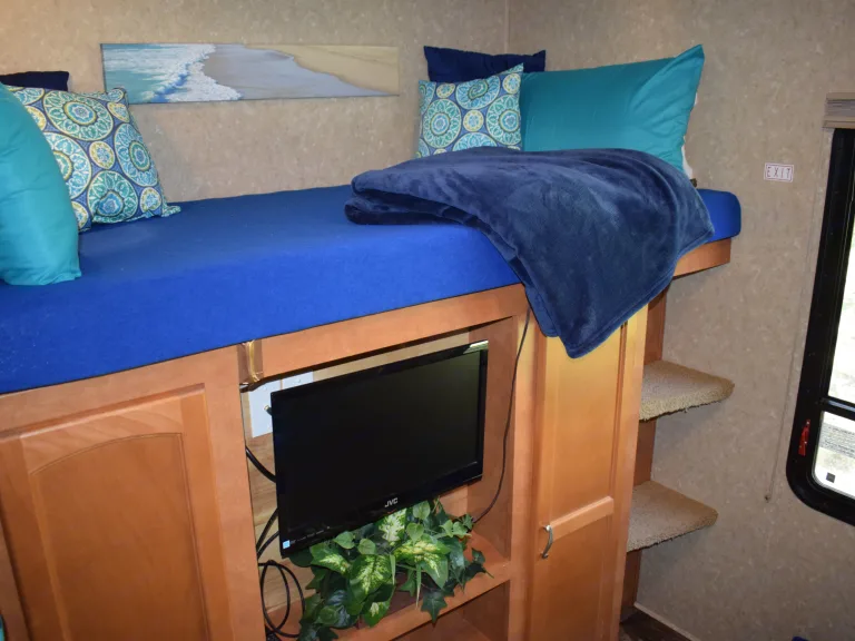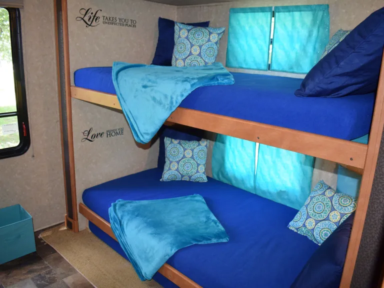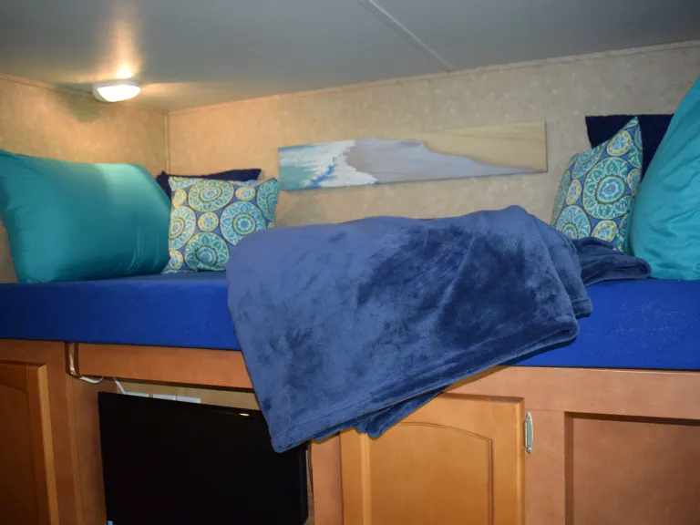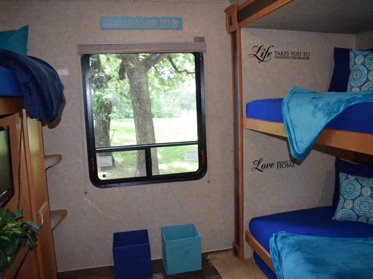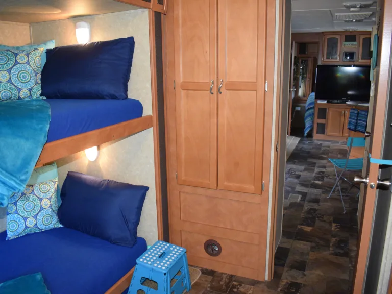 Fully stocked with linens, dishes and cookware. Fully-stocked outdoor kitchen with mini fridge/freezer and propane stove. Outdoor shower. Electric retractable awning. Two slideouts (living room and bunkhouse). Two entry doors (living room and bathroom). Three TVs (one in master BR, a 55" TV in living room, one in bunkhouse). Sleeps 8 adults or 10+ with smaller children. Two futons in dinette/living area, with four large, adjustable-height folding trays for dining. Four 5"-thick, full-size twin, memory foam mattresses in bunkhouse. Queen bed with memory foam mattress topper in master bedroom.Additional conveniences: 8'x16' outdoor rug • string lights and rope lights • plates/cups/bowls/utensils/flatware sets in Both kitchens • large pots and pans • burner-top griddle and electric griddle • plenty of plastic food storage • single-serve coffee maker • assortment of DVDs/BluRays, board games & card games • beach towels • small box fans • reflective insulation for windows • surge protector • propane tank level indicator • X-chocks (nearly eliminates bouncing) • add'l slideout stabilizers • leveling blocks • impact wrench • 25- and 50-foot extension cords • 30-amp and 50-amp dogbone adapters • fresh water hose, utility hose and 6-foot leader hose • hose Y-adapter with quick-connector • 40-foot misting hose with 10 sprayer nozzles • Rhino-Flex quick-connect sewer kit with transparent elbows • flexible sewer hose support • tire-pressure monitoring system