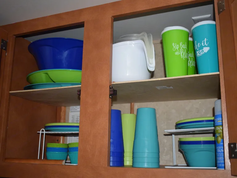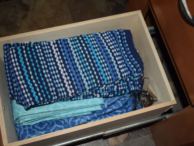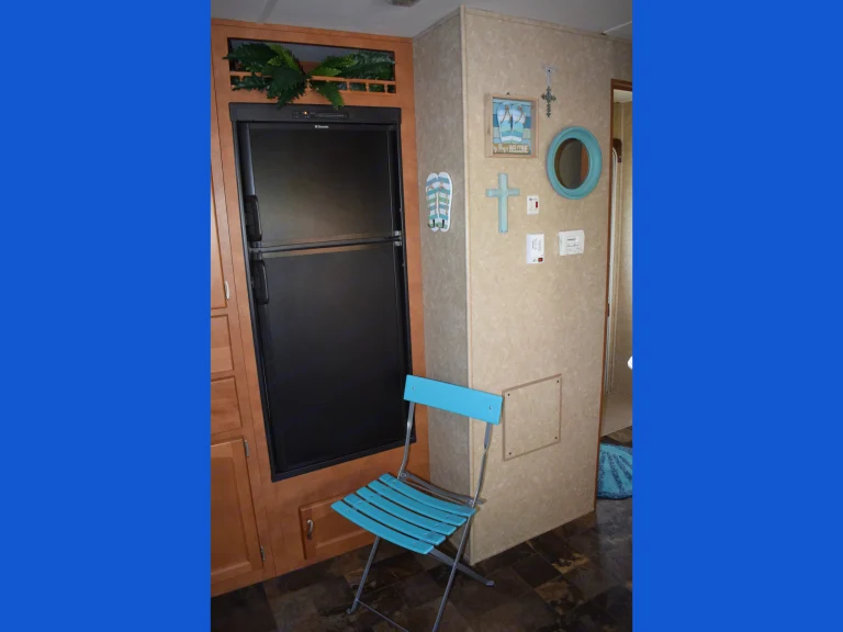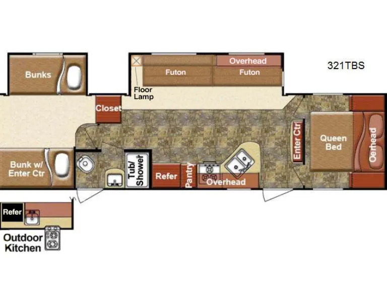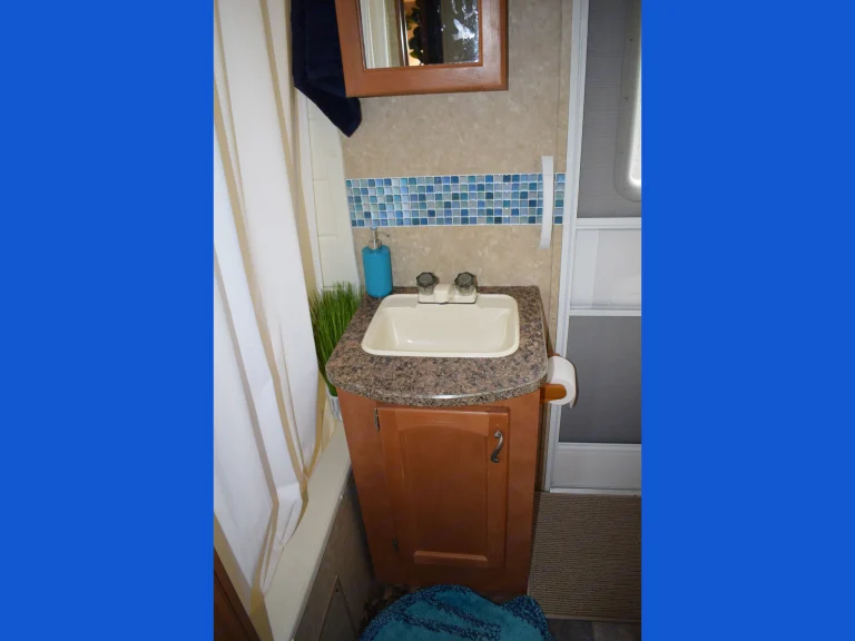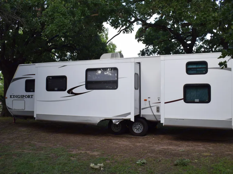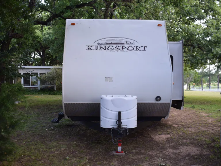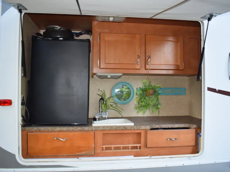 Fully stocked with linens, dishes and cookware. Fully-stocked outdoor kitchen with mini fridge/freezer and propane stove. Outdoor shower. Electric retractable awning. Two slideouts (living room and bunkhouse). Two entry doors (living room and bathroom). Three TVs (one in master BR, a 55" TV in living room, one in bunkhouse). Sleeps 8 adults or 10+ with smaller children. Two futons in dinette/living area, with four large, adjustable-height folding trays for dining. Four 5"-thick, full-size twin, memory foam mattresses in bunkhouse. Queen bed with memory foam mattress topper in master bedroom.Additional conveniences: 8'x16' outdoor rug • string lights and rope lights • plates/cups/bowls/utensils/flatware sets in Both kitchens • large pots and pans • burner-top griddle and electric griddle • plenty of plastic food storage • single-serve coffee maker • assortment of DVDs/BluRays, board games & card games • beach towels • small box fans • reflective insulation for windows • surge protector • propane tank level indicator • X-chocks (nearly eliminates bouncing) • add'l slideout stabilizers • leveling blocks • impact wrench • 25- and 50-foot extension cords • 30-amp and 50-amp dogbone adapters • fresh water hose, utility hose and 6-foot leader hose • hose Y-adapter with quick-connector • 40-foot misting hose with 10 sprayer nozzles • Rhino-Flex quick-connect sewer kit with transparent elbows • flexible sewer hose support • tire-pressure monitoring system