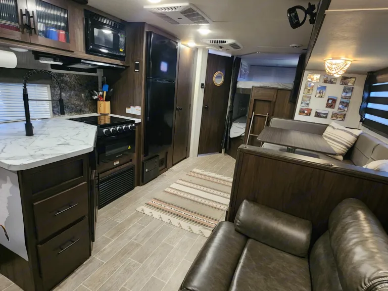 Spacious RV rental interior featuring a modern kitchen, comfortable living area with a sofa, and bunk beds. Ideal for family adventures.. Forest River Cherokee Grey Wolf Special Edition 2021