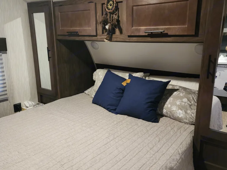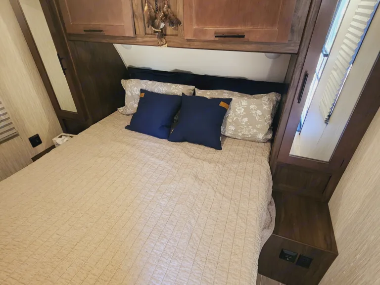 Cozy RV rental bedroom with a quilted bed, blue pillows, and wooden overhead cabinets, offering a comfortable space.. Forest River Cherokee Grey Wolf Special Edition 2021
