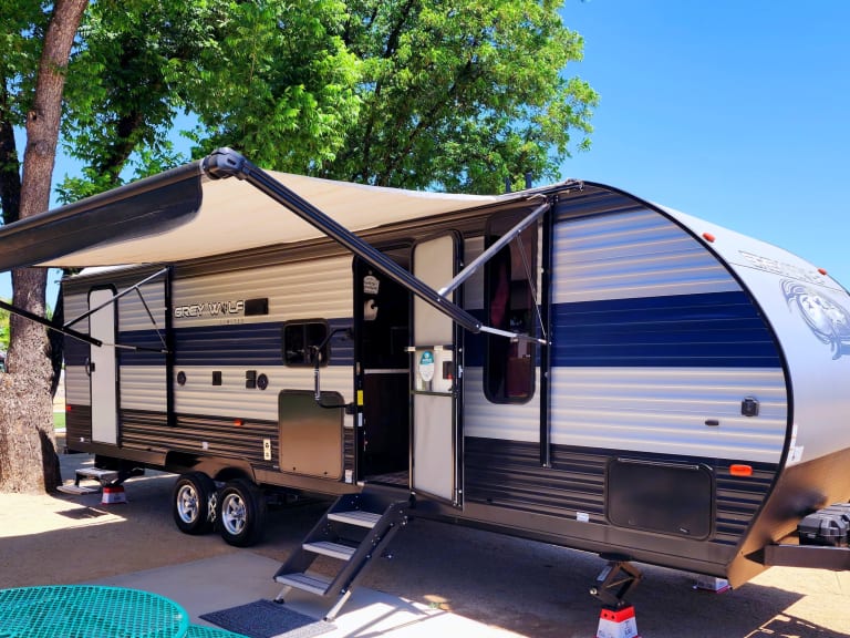 2021 Forest River Grey Wolf travel trailer. Home away from home equipped with everything you need for your camping experience. Inside features include 3 burner stove with hood vent and light, oven, large sink, refrigerator and large pantry. Bathroom has shower/tub, sink and toilet. Seperate private bedroom has a super comfortable queen bed with upgraded foam mattress and pillows. Bedroom also features a 32" TV. Living area couch pulls out into a bed. Dinette also coverts to a bed. Trailer also features 2 double bunks. Central AC and heater easy to control on thermostat.What's includedFresh linens