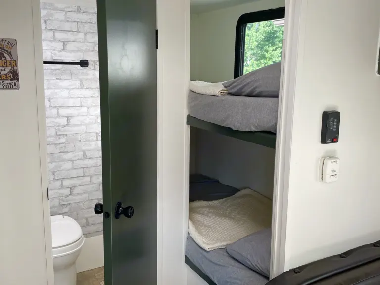 This is a 2019 Gulf Stream Ameri-Lite travel trailer. Trailer features a bunkhouse floor plan with a queen-sized bed, two twin bunk beds, toilet, shower, kitchenette, A/C, and TV. And dinette turns into a bed as well. The kitchenette includes a sink, two burner stove, refrigerator and freezer. The exterior includes a powered awning.What's included-Fresh Linens, pillows, and light quilt
