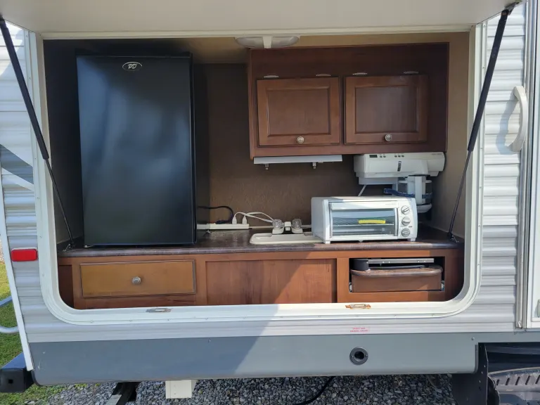 Our camper has 2 slides, one in bunkroom and one in living room, it is in same as new condition. Very well taken care of and ready for your enjoyment. It will come with paper/styrofoam plates, plastic ware, cups, paper towels and a full set of kitchen utensils including cooking pots and pans.All beds will have waterproof zip up cloth coverings that are cleaned and sanitized after each use. It has a cover for the couch that is easily removed and cleaned after each use as well. We supply hotdog forks for campfire cooking and 4 chairs to use around the campfire or when fishing. It has an outdoor kitchen with a coffeemaker and toaster oven. All the renter will need is blankets, pillows, bathroom essentials and food to have a good time. This is a Delivery Only rental and I am renting only to 45 minute radius of Huntington, WV.What's includedWe are renting this only locally at this time. The price includes delivery and set up/take down. You just show up at your rented site and it will be ready to enjoy.Other things to noteAbsolutely no smoking of any kind, no fishing gear inside the camper. Do not leave pet unattended in camper. If left alone, pet will need to be put in kennel while unsupervised. Always remember to bring awning in if there is a chance of wind/storm.