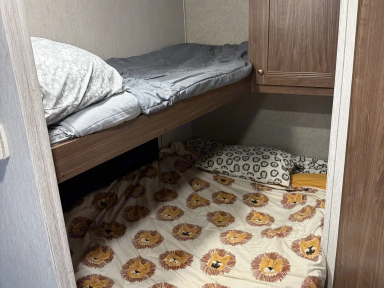 This spacious RV sleeps 6 adults comfortably, or up to 8 if there are kids, and features a cozy Queen bed up front with its own wall-mounted TV. Unwind on the convertible sofa or let the kids enjoy the bunk area with a double bed below and twin on top. The dinette table easily converts into an additional bed as well. Step outside to relax under the awning and groove to your favorite tunes with built-in outdoor speakers.