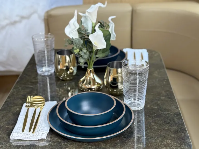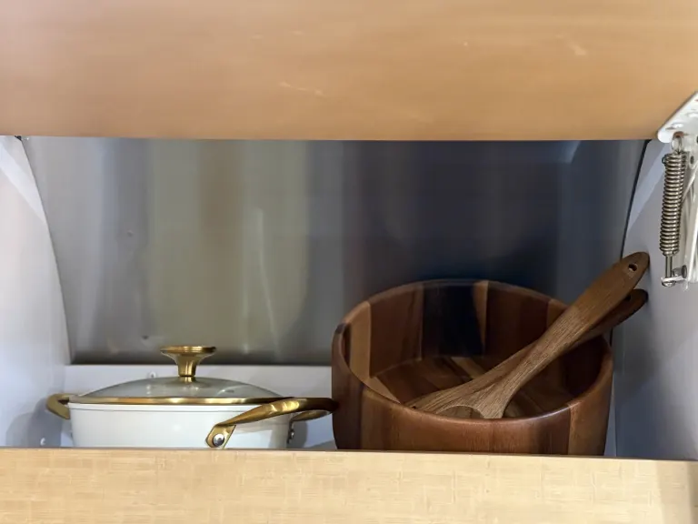 800-thread count sheets, duvet, cooling memory foam topper four king-size and 2-queen size pillows, robes, oversized bath towels, hand towels and wash cloths, Aesop products, hairdryer, Microwave, Refrigerator, stove, oven, Green Pan cookware, Flatware, knives, dinnerware, wine glasses, whiskey glasses, water glasses, coffee mugs, Nespresso coffee maker, French press, herbal teas, one pot, salad bowl and cooking utensils, board games, a TV with Roku and DVD player. Some movies will be provided.Other things to noteNo smoking, no dry camping, 1 pet only upon request. Use awning at renters risk.