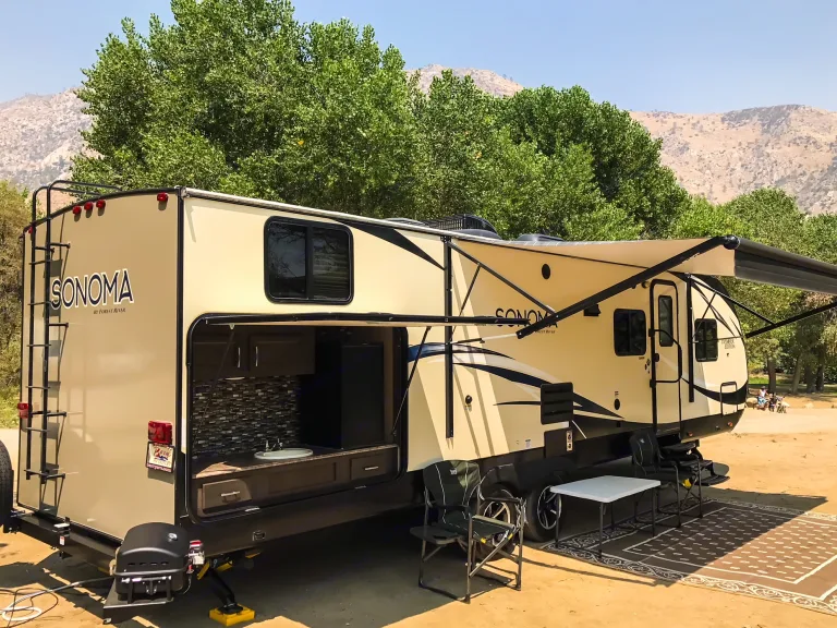 This 2018 Sonoma is a very nice bunkhouse model. Large slide-out, outdoor kitchen, awning with LED lights, this beautiful trailer has it all!! Accommodates up to 8 people. (Bunks do have factory set weight limits, so that should be considered when planning sleeping arrangements)Free delivery for 3+ night reservations to the following Kernville Campgrounds: Rivernook, KRS Camp James, and Frandy. $50 delivery to Mountain & River Adventures. If you would like delivery to an out-of-area location, please contact us to discuss pricing, or include this info in your quote/reservation request. We are unable to deliver to any Forestry Campgrounds.All units come with a 9x12 outdoor area mat. Be sure to check any add-on's that you might need, such as linens or additional outdoor living items to make your trip more enjoyable.What's Included