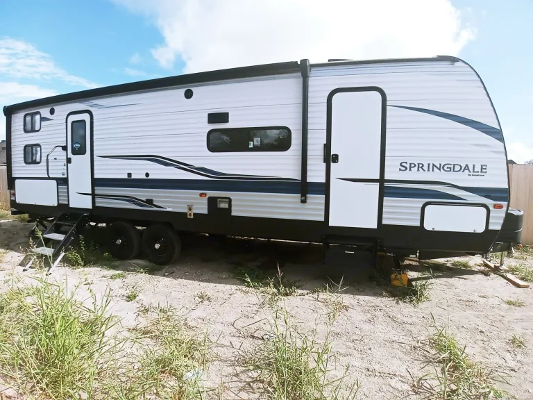 This 2021 Springdale is perfect for the family or for just the adults. It is set up for dry camping or staying at a RV resort.Comfortably sleeps 8 peopleQueen Bed up frontTwo bunks in the back max weight 250Table that turns into a bedCouch that pulls out into a bedElectric Awning with LED lightsInterior/Exterior bluetooth Speakers50" TV and Blu-ray playerElectric FireplaceSuper SlideoutOutdoor ShowerOutdoor KitchenElectric Stabilizer JacksTwo propane tanksLaundry chute in bedroomTwo half closets in bedroomLarge underbed storageLarge storage area in the front of RVLarge Storage closet at the back of RVFull indoor ShowerFlex fuel generator that uses gas or propanefully equipped sink, induction stove, microwave, ventilation and heater.This rig is also jam-packed with high-end components. Springdale has a furnace/water heater system, generator and great cabinetry handcrafted with soft close doors/drawers and custom trims with all the bells and whistles. This RV is perfect for your ultimate road trip.Delivery and pickup within 50mi radius available upon request.Length 32' 11"