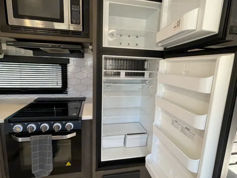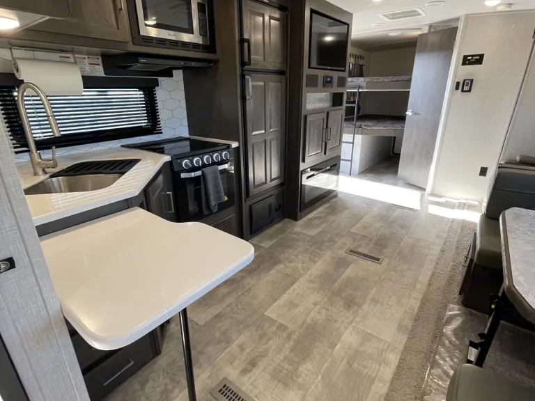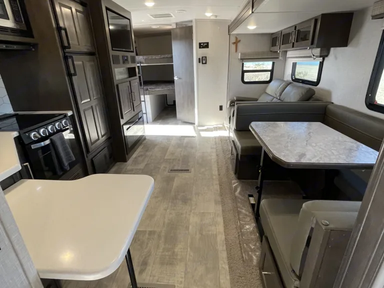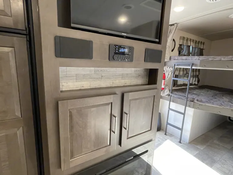 2 Power awning (DO NOT USE Unattended, Wind Damages Start AT $700 FOR Repair/ Replace) with LED lighting for shaded campfires, plus outdoor kitchen goodies like a fridge, sink, or cooktop on some units for cooking under the stars.Tech and comforts keep it modern-Western: 2 air-conditioning systems , 13,500–15,000 BTU A/C, 35,000 BTU furnace, 54-gal fresh water, big gray/black tanks (~90/45 gal), power stabilizer jacks, and that classic laminated fiberglass exterior in champagne tones for a tough, good-looking ride. Add in the entertainment package (LED TV, stereo with indoor/outdoor speakers), and you've got a rolling bunkhouse saloon that's equal parts cozy and adventurous.