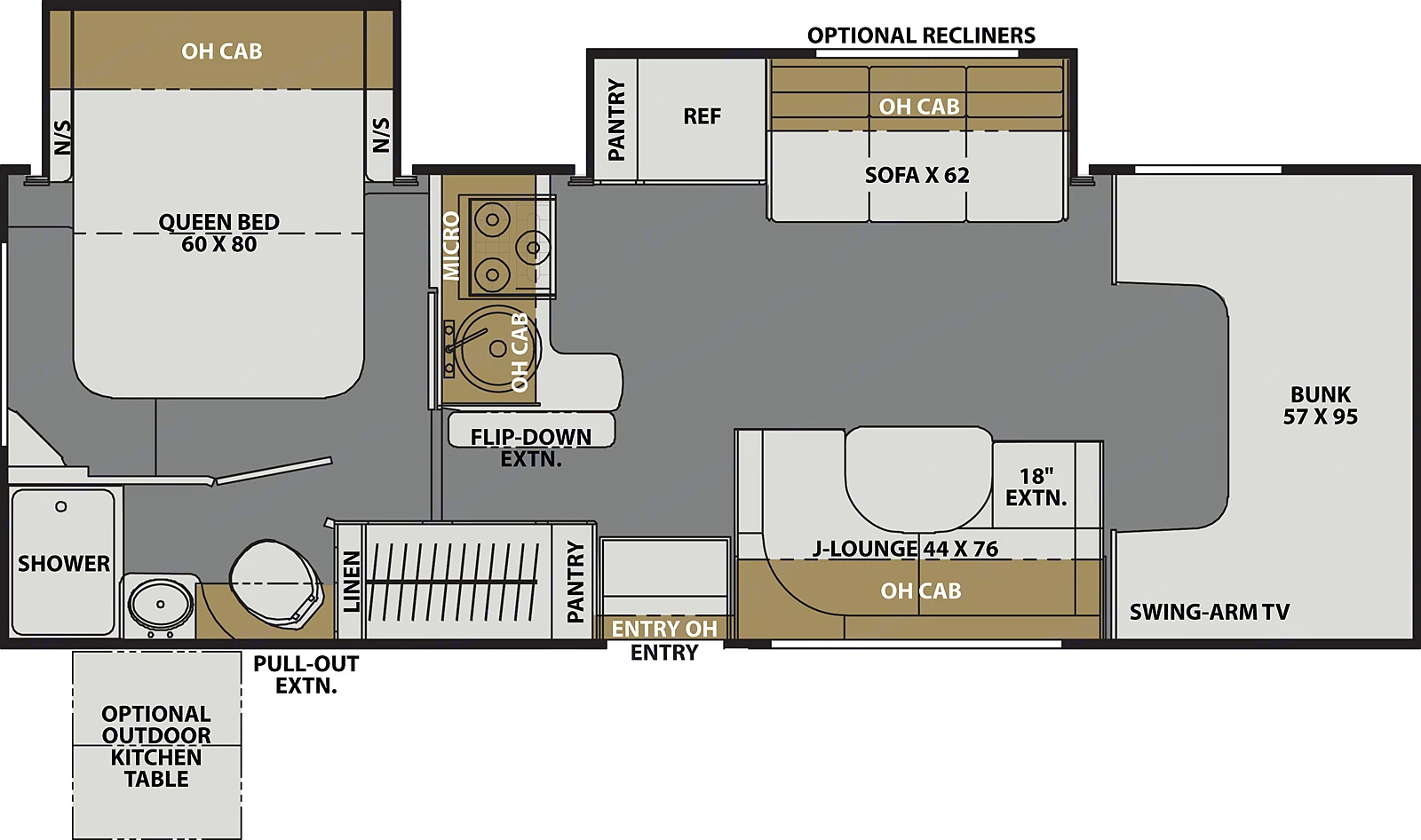 The bathroom features a toilet, sink, and shower.Freshwater holding tank with 50 gallons and both gray water and blackwater holding tanks with 31 gallons each.A manual of instructions is included with the rental.This rental is for a family-friendly camping experience. No smoking (cigarettes, marijuana, vaping, or otherwise) inside the camper.Additional Pick up and drop off information
