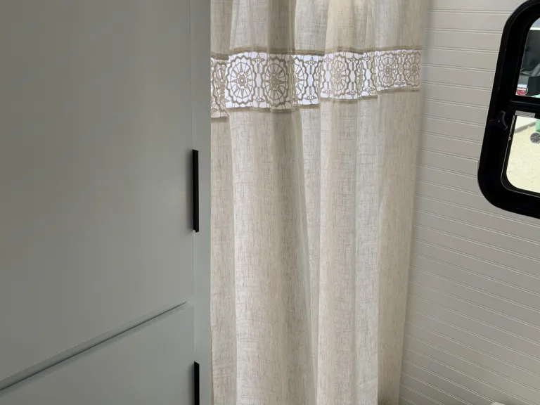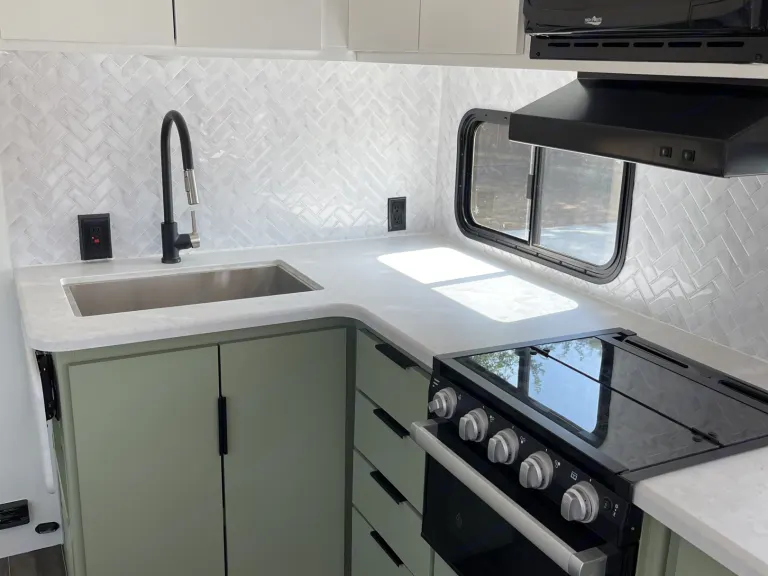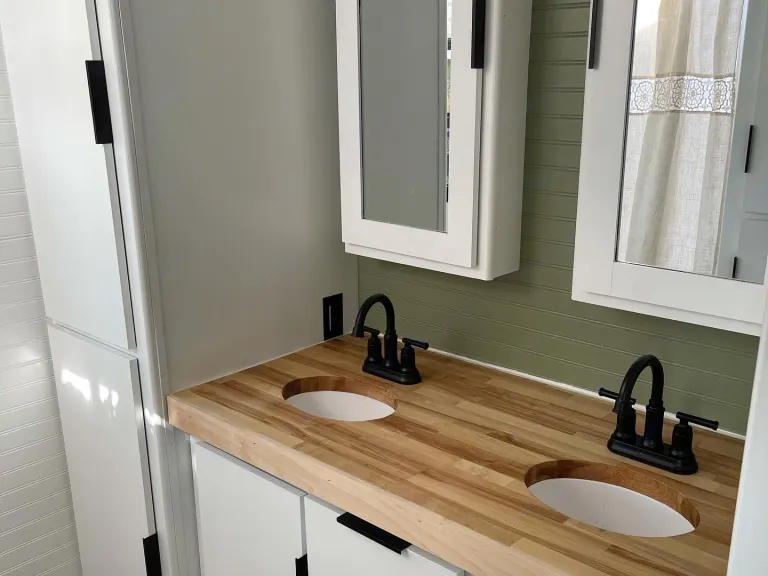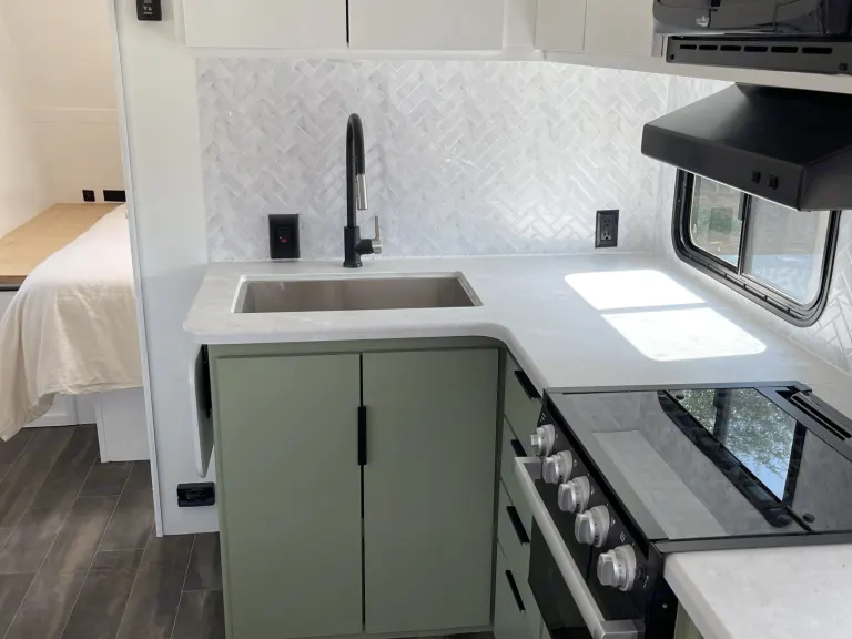 This trailer is new but updated to be a boho/modern vibe. Think of it as a glamping trailer! Sleeps 3 comfortably with room for 4-6 if you would like to use an air mattress.This trailer has a full service with a large kitchen counter. Electric fire place below the TV that actually blows warm air! It has a fun and modern color scheme of white, tan and sage green. The space feels open and spacious with plenty of room for activities. Kitchen is fully stocked and includes the essentials: plates, bowls, cups, utensils, knife set, cutting boards, cookie sheets, pots, pans and a keurig coffee maker!Bathroom has double sinks, plenty of storage, a skylight above the standup shower, and equipped with luxury shampoo, conditioner, and body wash!A modern air conditioning unit that will keep you cool or heat up the trailer quickly! There also is an indoor/outdoor speaker system available via Bluetooth or USB port!Happy GlampingWhat's included*WHATS INCLUDED AT NO EXTRA CHARGE*-Basic kitchen essentials: plates, bowls, cups, utensils, knife set, cutting boards, cookie sheets, pots, pans and a keurig coffee maker!